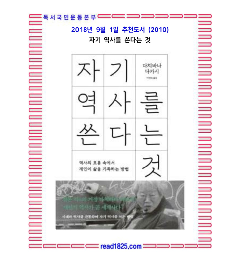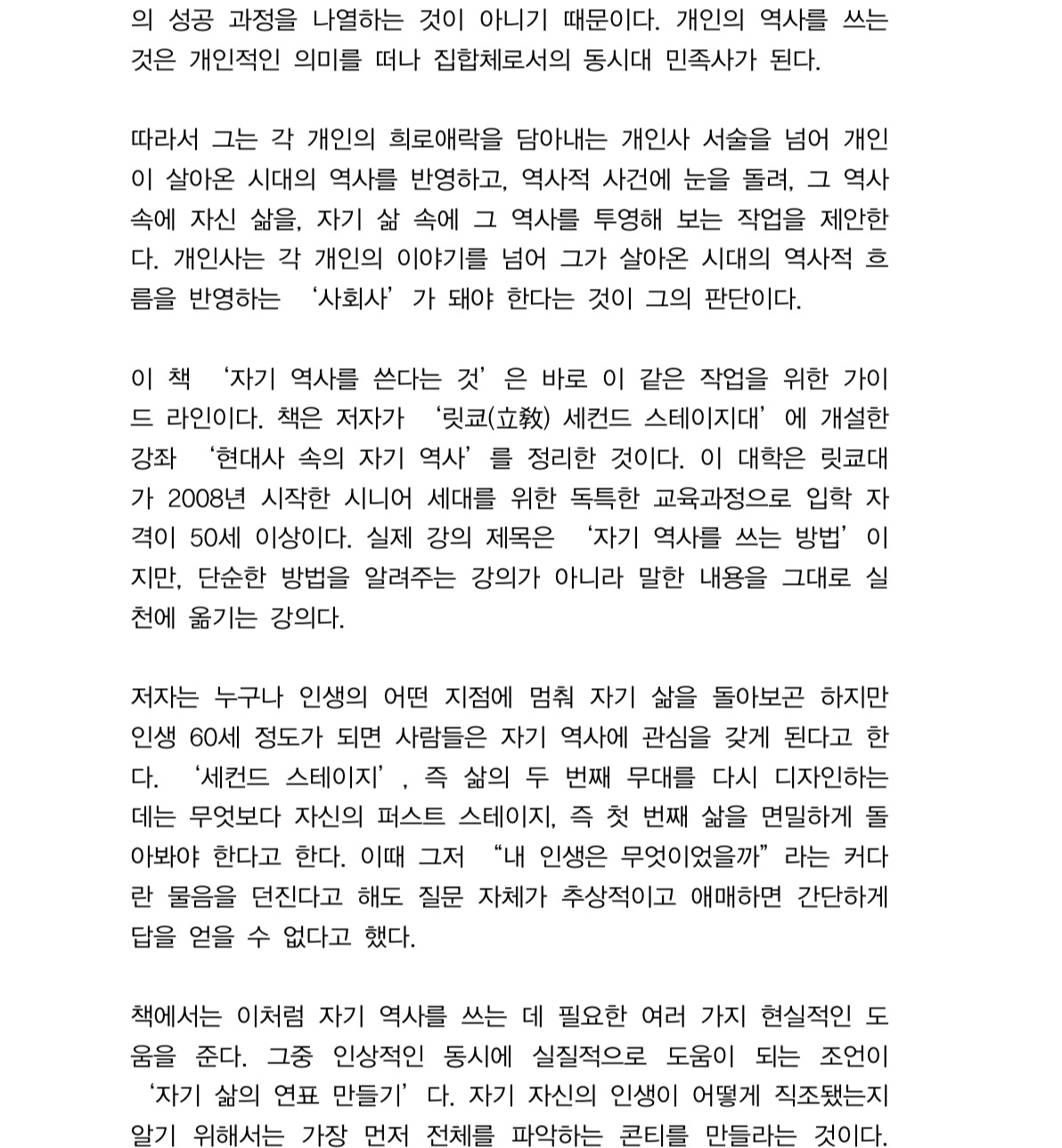 다치바나 다카시는 인생 60이 되면 자기 역사에 관심을 갖게 된다고 말한다. 하지만 한 단계의 인생을 정리하고 다음 단계를 준비하는 것이 자기 역사를 쓰는 이유라면 꼭 60세까지 기다릴 필요는 없다. 지금까지 살아낸 자신의 삶 속에서 다음 단계를 준비하고자 할 경우, 길든 짧든 자신의 삶의 역사를 그 시대의 역사적 사건과 함께 정리해 볼 수 있기 때문이다. 결국 자기 역사를 쓰는 일은 모든 세대를 위한 일이다.