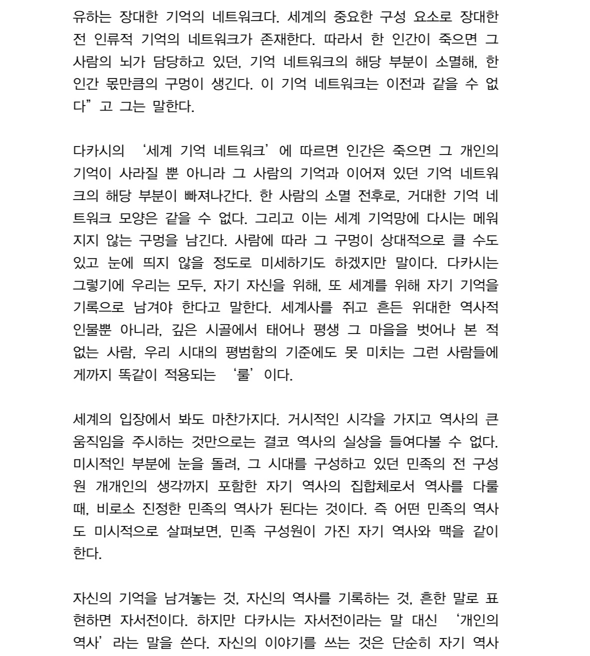 인식할 수 없지만, 모든 인간은 세계 기억 네트워크의 한 부분을 담당하고 있다. 언젠가 한 사람 한 사람이 죽음을 맞이하면 세계 기억 네트워크는, 아주 미세한 부분이겠지만, 이전의 그것일 수 없다. 결국 한 사람 한 사람의 ‘자기 역사’가 곧 세계사이며, 그것을 온전하게 이뤄내는 글쓰기 행위가 바로 ‘자기 역사를 쓴다는 것’이다.