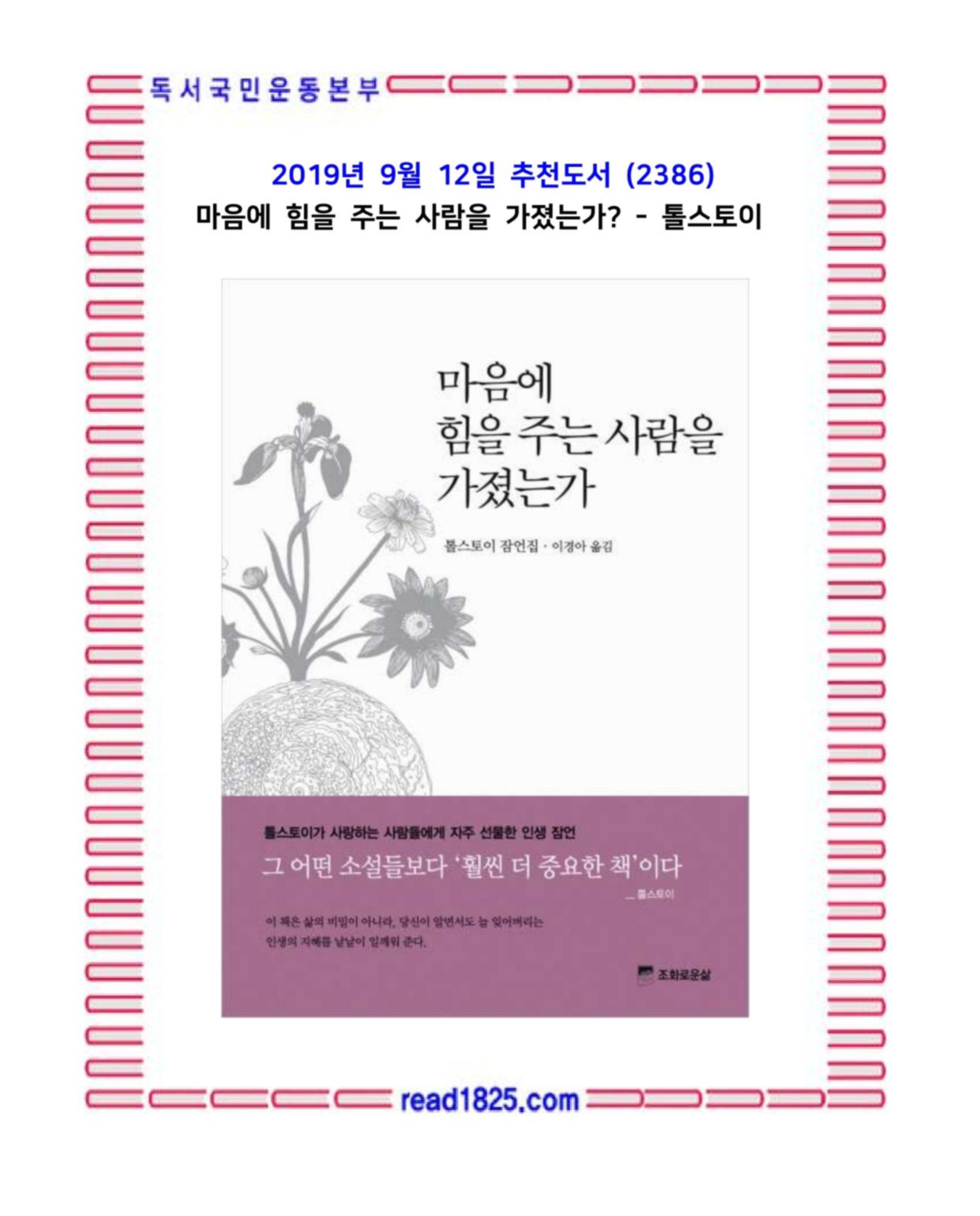 이 책은 처세를 위해 읽는 책이 아니다. 현학적인 사람이 되기 위해 읽는 책도 아니고, 승진이나 자기계발을 위한 책도 아니다. 이 책은 자기 영혼에 투자하는 책이다. 우리의 남은 인생을 위해 읽어야 할 책이다. 많은 지식을 얻는 일보다 인생의 지혜를 배우는 일이 얼마나 중요한지 톨스토이는 잠언을 통해 우리에게 알려준다.
