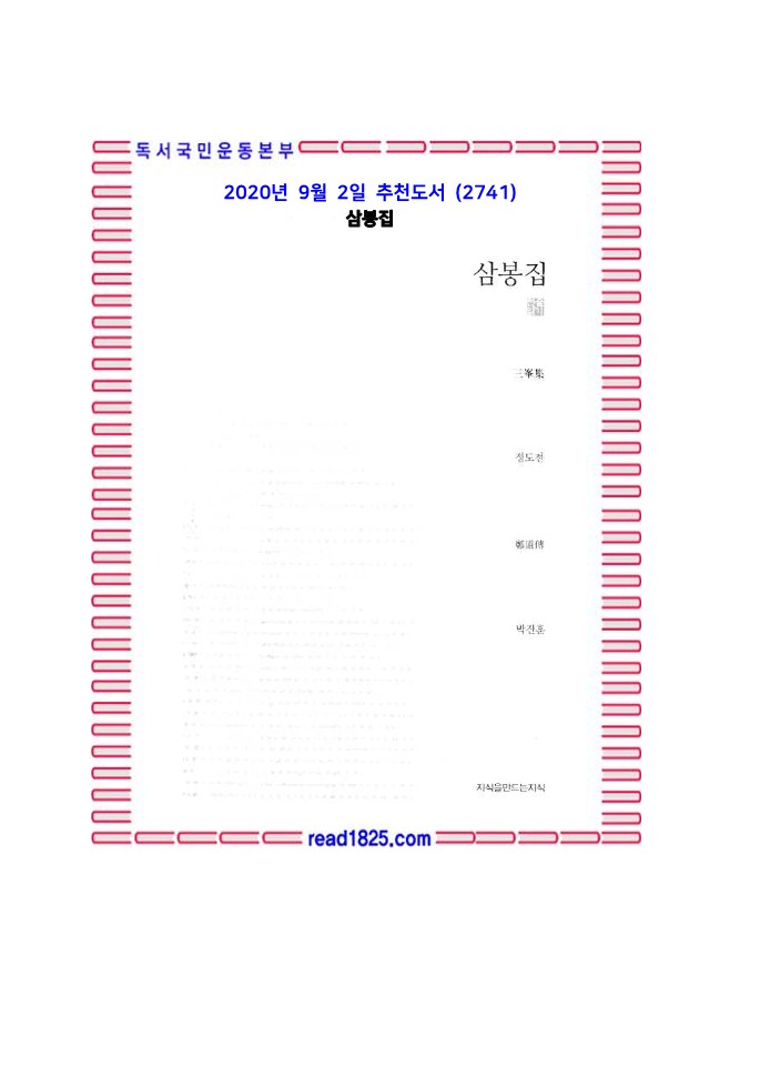이 책은 정도전이 평생에 걸쳐 쓴 글을 모아 편찬한 것이다. 부, 오언 및 칠언 고시, 율시, 악장, 소, 서, 기, 제문 등 다양한 형식과 내용의 글들을 맛볼 수 있다. 정도전은 고려 말에서 조선 초라는 격변의 시기를 살았고, 그 시대의 역사를 만들어간 사람이다. 정도전 개인이나 그가 살았던 한 시대를 이해하기 위해서만이 아니라, 조선이라는 나라의 건국과 그 의미를 이해하기 위해서 반드시 읽어보아야 할 책이라고 할 수 있다.