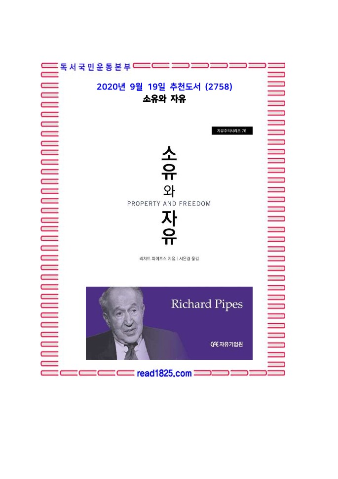 소유권에 대한 보장과 개인의 자유 사이에는 긴밀한 관계가 있다는 가설이 〈소유와 자유〉의 출발점이다. 즉, 자유가 없어도 어떤 형태로든 소유는 존재할 수 있지만 그 반대는 상상할 수 없다는 것이다. 리처드 파이프스는 1999년에 출간한 〈소유와 자유〉를 통해 인류 역사의 기록을 거슬러 올라가 소유와 정치제도 간의 관계를 살펴보았다. 경제와 정치라는 두 주요 세력 간의 관계는 역사적 사례를 통해 명쾌하게 증명된다. 특히 사유재산제도가 발달했던 영국은 자유롭고 발전된 사회를 이루었지만, 사유재산제도가 없었던 러시아는 자유가 발달하지 못했으며, 그 결과 전제정권이 장기간 통치했다. 이 책을 통해 소유의 존재와 부재가 자유와 민주주의의 발전에 어떤 영향을 미쳤는지를 확인한다면, 우리가 가장 소중하게 지켜야 할 가치가 무엇인지 이해할 수 있을 것이다. 복지국가라는 공공선을 위한다는 명분으로 정부의 규제가 점점 심해지고, 개인들의 자유와 재산권이 크게 위축되고 있는 요즘, 〈소유와 자유〉는 우리에게 귀중한 경고문이 될 것이다.