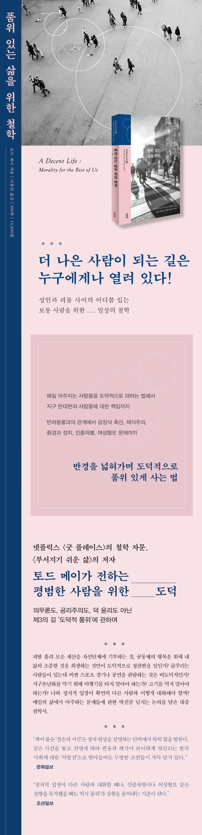 그렇다고 우리가 말하는 ‘더 나은 사람’이 이타주의자나 전통적 도덕 이론이 요구하는 것처럼 한평생을 착한 일에 바치고, 가진 재산의 전부를 기부하는 등 극단적인 희생으로 완벽한 윤리를 행하는 도덕적 성인은 아니다. 우리가 그러한 도덕적 요구에 완벽하게 부응하며 살아가기는 어렵고, 사실상 불가능하다. 미국 철학자 토드 메이는 《품위 있는 삶을 위한 철학》에서 보통 사람들에게 소중한 것을 포기하지 않으면서도 일상에서 실천할 수 있는 ‘품위decency’라는 대안을 제시한다. 이 책은 이타주의에 비하면 다소 소박한 목적을 가진 삶, 그렇지만 도덕적 평범함은 벗어난 생활을 영위할 수 있는 실천 가능한 방법을 전한다. 매일 마주치는 사람들을 도덕적으로 대하는 법에서 지구 반대편의 사람들에 대한 책임까지, 반려동물과의 관계에서 채식주의, 환경과 정치, 인종차별, 여성혐오 문제까지. 반경을 넓혀가며 철학 이론이나 사회 문제를 다루면서도 풍부한 사례를 들고, 저자 특유의 유머와 명석한 통찰을 더했다.
