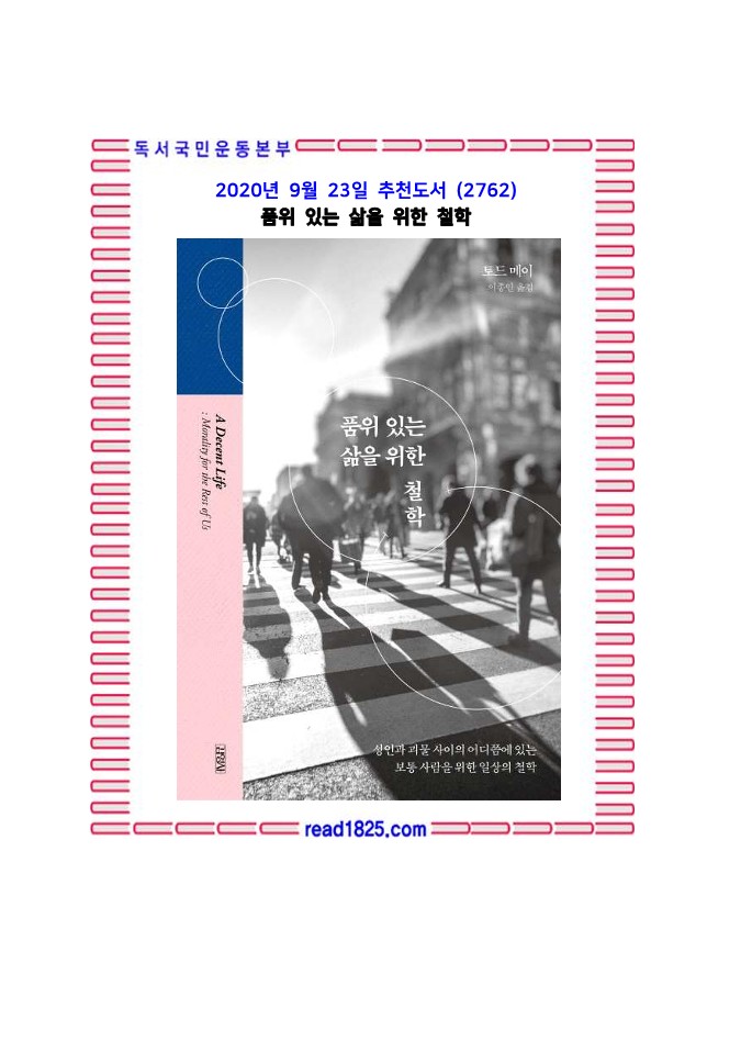 여러 권의 대중 철학서를 집필했고, 넷플릭스에서 방영한 드라마 〈굿 플레이스〉의 철학 자문을 맡기도 한 미국의 철학자 토드 메이는 『품위 있는 삶을 위한 철학』에서 이러한 질문들에 답하는 하나의 기준으로 ‘품위’라는 도덕적 생활 방식을 제시한다. 그 시작이자 핵심은 ‘타인의 존엄’을 인정하는 것이다. 매일 마주치는 사람들을 도덕적으로 대하는 법에서 지구 반대편의 사람들에 대한 책임까지, 반려동물과의 관계에서 공장식 축산, 채식주의, 환경과 정치까지 반경을 넓혀가며 보통 사람들에게 도덕적으로 ‘품위 있게’ 사는 법을 알려준다.