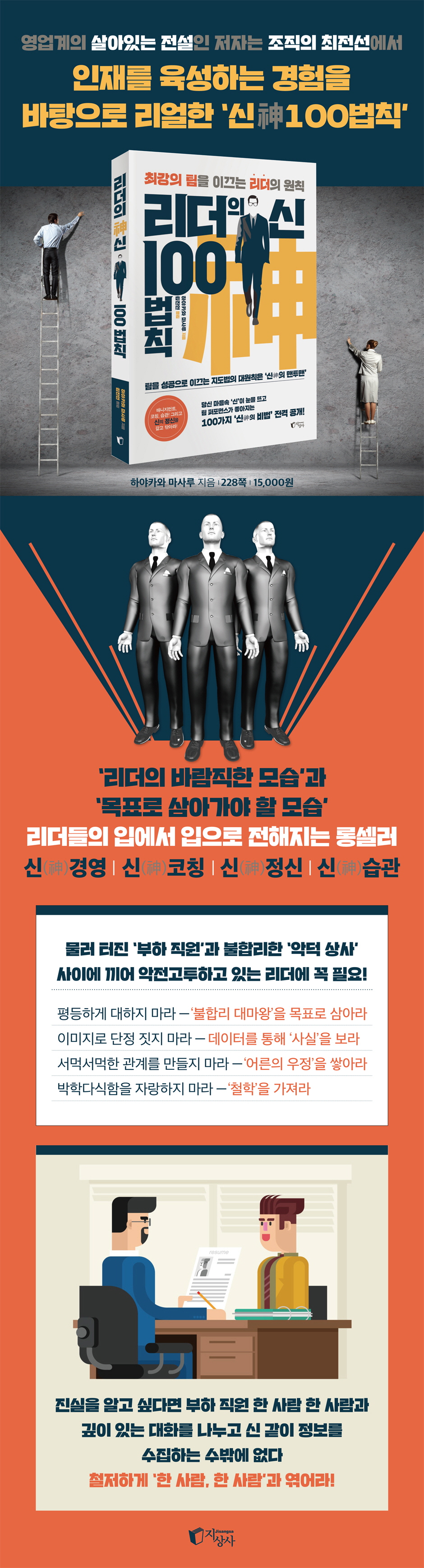 과연 당신의 마음속 깊은 곳에 잠들어 있던 ‘리더의 신’이 눈을 뜨고 부스스 일어나기 시작했을까? 앞에서도 언급했듯 신의 정의는 ‘본래 당신 안에 존재하고 있지만, 평소에는 제대로 발휘되지 않는 강한 인내와 생명력을 이용하여 이성, 지성, 사랑으로 소원을 이루어 나가는 ‘터무니없을 정도로 강한 힘’을 의미한다. 그렇다. 당신에게는 그런 힘이 ‘있다’ 다만 지금까지는 그 ‘신’이 잠들어 있었을 뿐이다. 여기까지 다 읽고 수많은 ‘신의 격언’에 머리를 흠씬 두들겨 맞은 당신, 리더로서의 ‘긍지’가 되살아나 지금 당장이라도 부하 직원을 안아주고 싶을 정도로 애정과 열정이 넘쳐흐르지는 않는가? ‘마음을 다잡는=각오’가 여전히 부족했던 ‘과거의 자기 자신’을 맹렬히 반성하고 당신의 리더의 혼에 불이 붙었기를 바란다. 한편 이미 당신이 실력파의 숙련된 리더라면 100개 항목에 달하는 ‘신 리더의 비법’을 ‘복습’하여 머릿속이 한결 정리되고 ‘리더의 바람직한 모습’과 ‘목표로 삼아가야 할 모습’이 새삼 명확해졌으리라. 이만큼 밀도 높은 콘텐츠가 가득하고 신랄하고 독설적인 리더 지도서는 일찍이 존재하지 않았고, ‘앞으로도 영원히 그 누구도 쓸 수 없지’ 않을까? 그만큼 심혈을 기울여 집필한 작품이다.