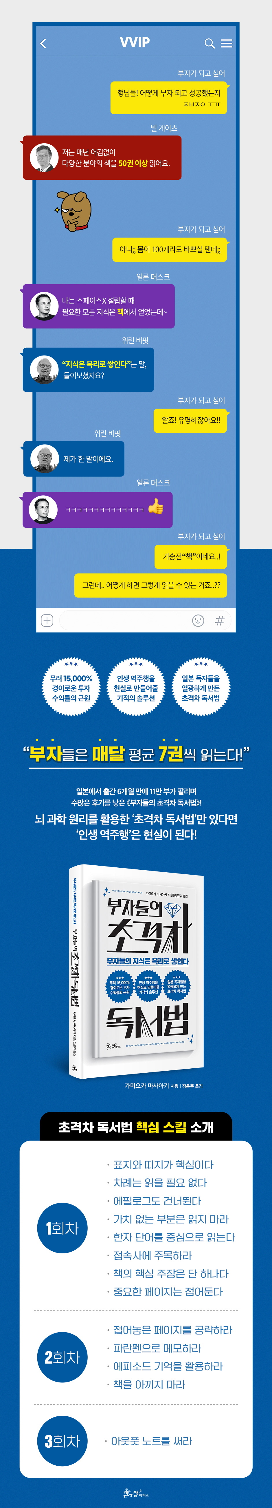일본에서 출간 6개월 만에 11만 부가 팔리며 수많은 후기를 낳은 《부자들의 초격차 독서법》은 한 권의 책을 단 ‘30분’ 만에, 그것도 ‘3번’ 읽을 수 있는 방법을 알려준다. 혹자는 이 설명을 듣고서 ‘그렇다면 속독과 다른 점이 뭐지?’라고 생각할 수도 있다. 이 책이 말하는 ‘초격차 독서법’은 단순히 속도만 높여 결국 머릿속에 아무것도 남지 않는 속독과 달리 책이 담고 있는 귀중한 지식을 절대 놓치지 않게 해준다. 이것이 가능한 이유는 뇌 과학의 원리를 독서법에 활용했기 때문이다.