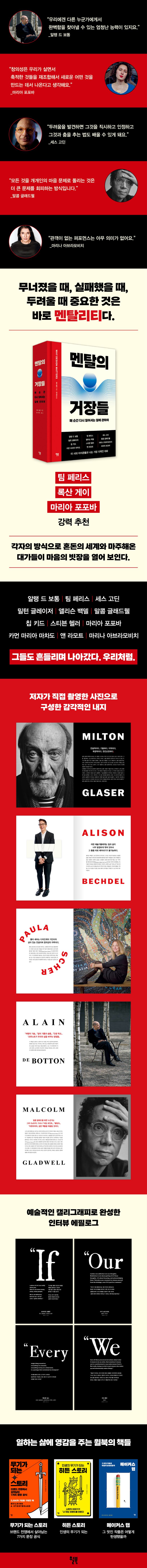 아이디어와 회복 탄력성, 끊임없는 노력과 불굴의 희망, 낙관주의, 기꺼이 성장하고 변화하며 진화하려는 태도가 더해지면 어떤 일이 가능할지 확인하고 싶다면 이 책 『멘탈의 거장들』을 권한다.