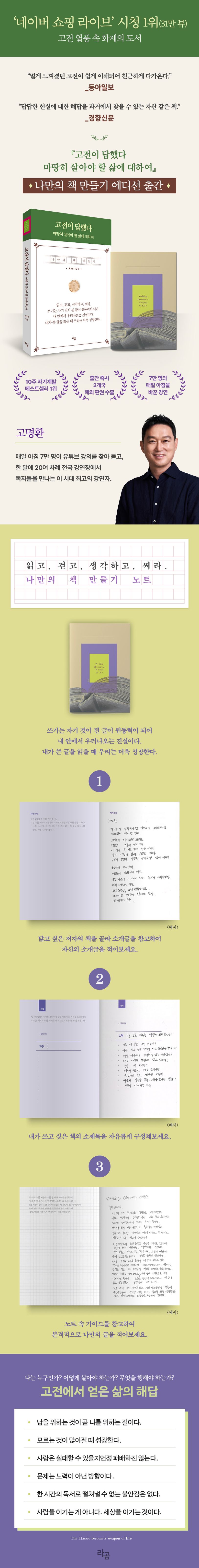 매일 아침 7만 명이 유튜브 강의를 찾아 듣고, 한 달에 20여 차례 전국의 강연장을 찾아가 독자들을 만나는 이 시대 최고의 강연자. 30만 독자가 기다린 베스트셀러 저자 고명환이 지난 10여 년간의 인생 내공이 응축된 책, 『고전이 답했다 마땅히 살아야 할 삶에 대하여』에서 고전(古典)에서 길어 올린 흔들림 없는 삶의 내공을 전한다.