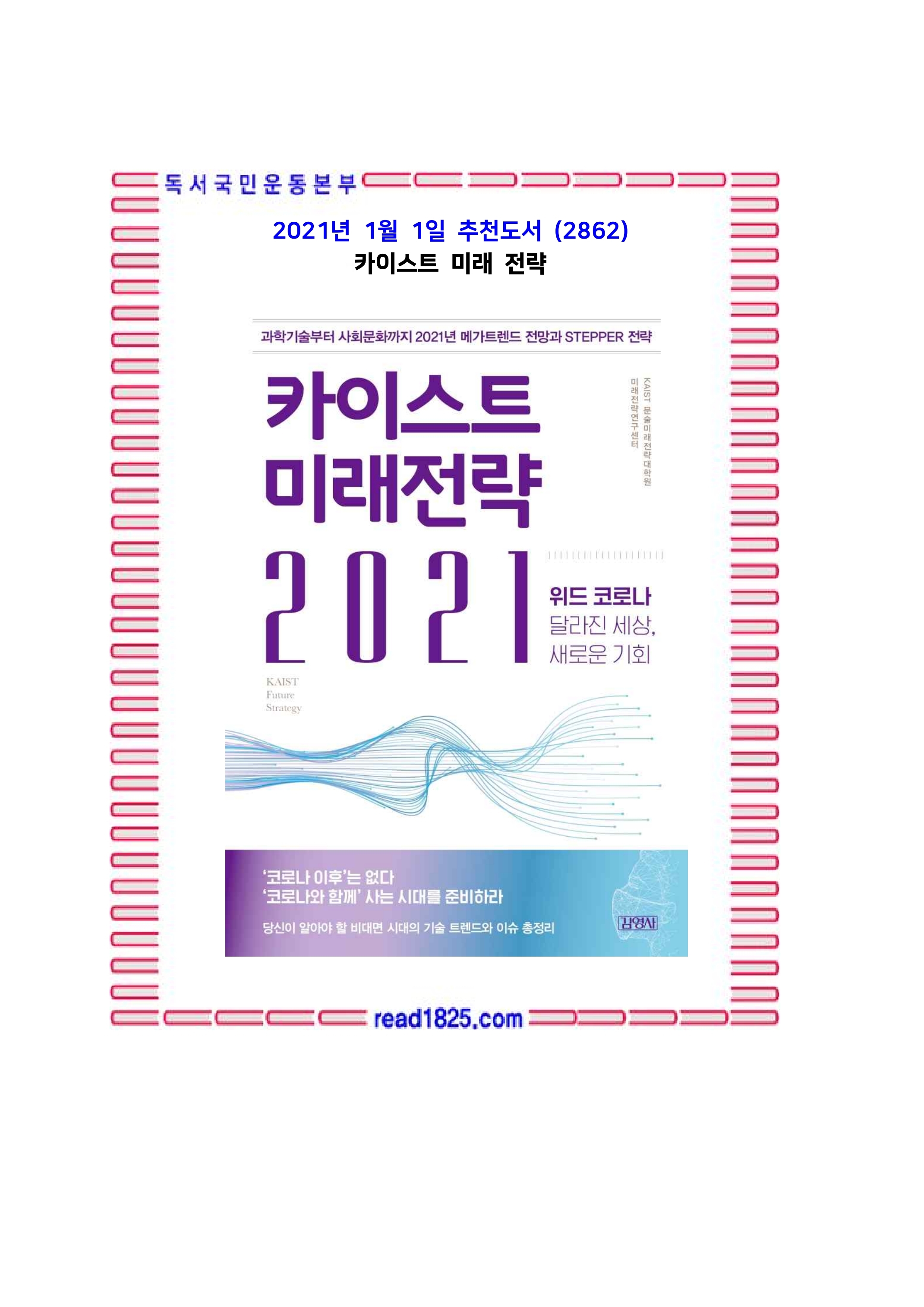 이 책은 기술발전의 시간적 흐름이라는 수직적 관점과 동서양을 넘나드는 수평적 관점으로 2021년을 통합적으로 진단한다. 1부에서는 코로나19가 인류의 생활양식을 어떻게 바꾸었는지 살펴본 다음 2021년에 주목해야 할 이슈, 기술의 변화, 해결과제를 짚어준다. 2부에서는 새로운 세상에서 기회를 잡기 위한 전략을 사회(Society), 기술(Technology), 환경(Environment), 인구(Population), 정치(Politics), 경제(Economy), 자원(Resources) 7개 분야로 나누어 설명한다. 이를 각각의 앞글자를 따 STEPPER 전략이라고 이름 붙였다.