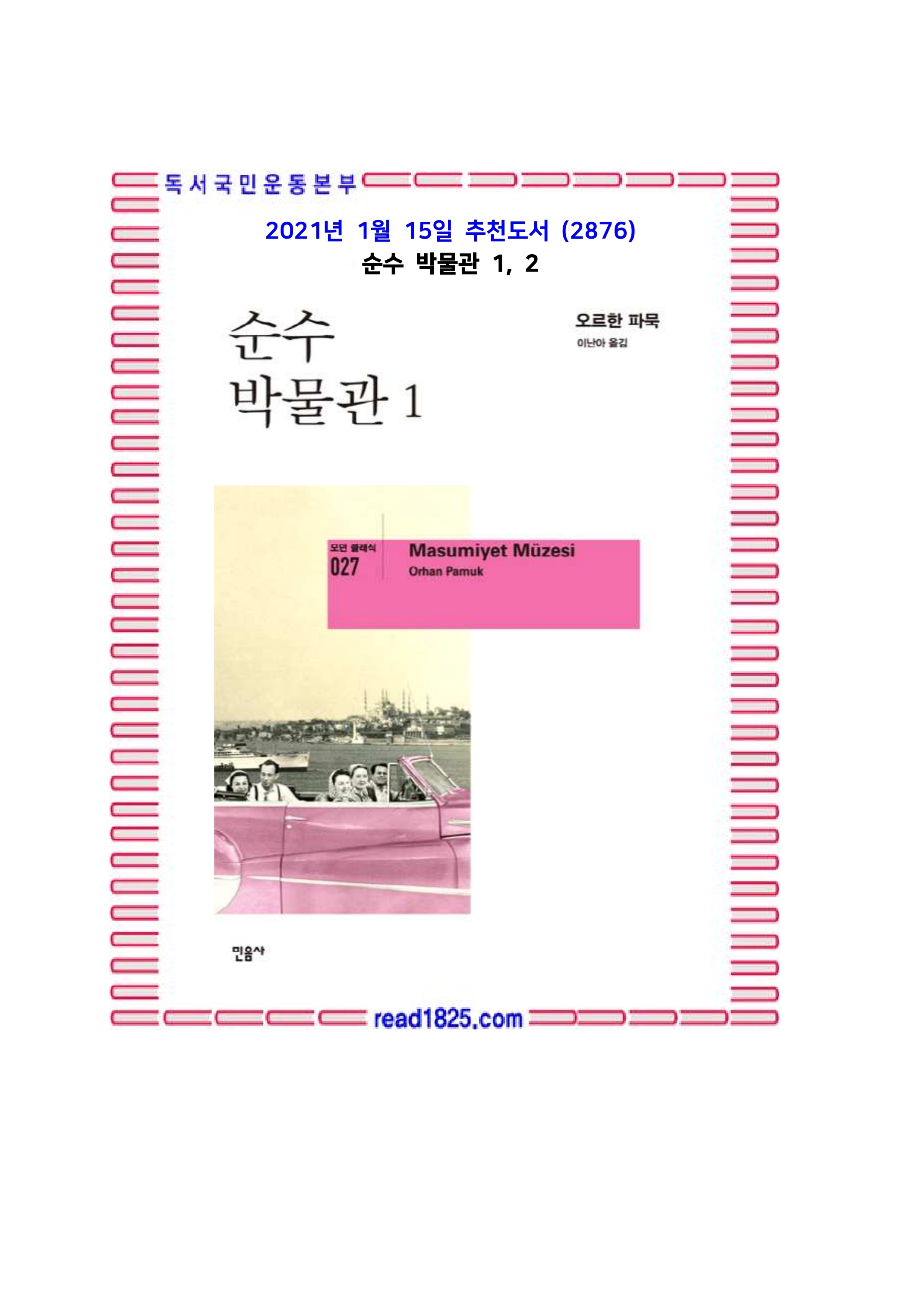 오르한 파묵이 노벨문학상 수상 이후에 처음 선보이는 장편소설『순수 박물관』제1권. 1980년 이후 전 세계에서 발표된 작품들 중에서 '미래의 고전'으로 자리 잡을 작품들을 엄선한「모던 클래식」시리즈의 27번째 책이다. 한 남자의 30년에 걸친 저절하고 지독한 사랑과 집착을 그리고 있다. 1975년 터키 이스탄불, 모든 것을 가진 남자 케말 앞에 아름다운 여자 퓌순이 나타난다. 케말은 자신과 비슷한 집안 출신인 애인 시벨과 결혼해 행복한 가정을 꾸리는 한편, 퓌순과도 계속 만나면서 삶을 즐길 생각을 한다. 하지만 그의 성대한 약혼식에 나타난 퓌순은 그날 이후 자취를 감춰 버린다. 그제서야 케말은 그녀를 향한 사랑을 깨닫게 되고, 그녀를 찾아 헤매기 시작하는데….