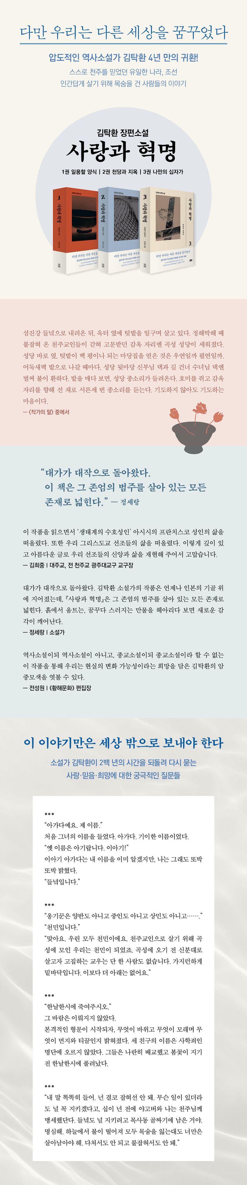 『사랑과 혁명』은 땅만을 섬기던 농부 들녘이 하늘만을 믿던 아가다를 만나 세상이 금하는 신(神)을 믿어 가는 과정과, 그 신을 믿기 위해 목숨 건 교우들과 이들을 추적하고 탄압하는 무리들의 팽팽한 갈등을 담고 있다. 순교자들의 행적을 기록한 책인 ‘치명록’의 형식을 차용하여 액자식 구성을 띤 작품은 3권에 걸쳐 정해박해를 기점으로 전후에 일어난 천주교박해를 배경으로 공동체를 이루고 살아가는 교인들의 시간을 따라간다. 1권에서는 곡성 교우촌에서 마을 사람들과 함께 옹기를 만들며 사랑을 빚는 시간을, 2권에서는 천주교인과 첩자, 군관이 숨고 달아나고 쫓고 쫓는 추적의 시간을, 3권에서는 옥 안팎에서 다시 신부를 모셔오기 위한 움직임과 기다림의 시간을 담고 있다.