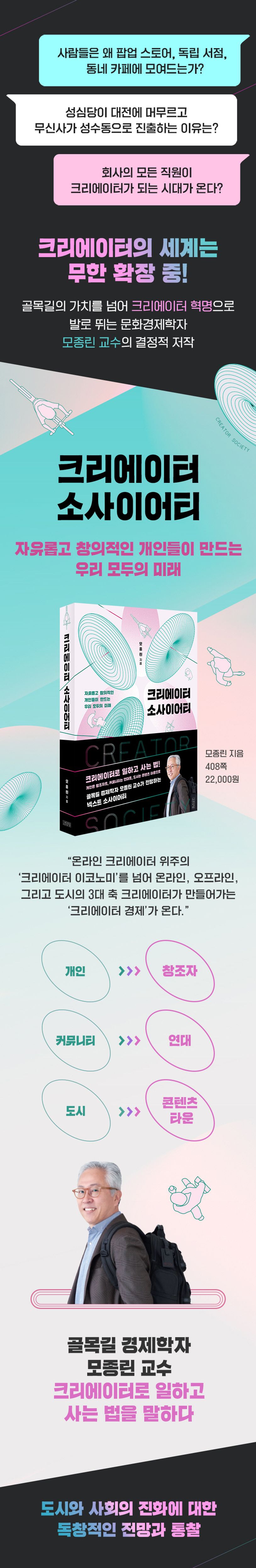 대학에서 강의와 연구를 병행하면서도 꾸준히 전국의 골목골목을 찾아다니며 사람과 돈이 모이는 공간의 비밀을 탐구해온 경제학자. 모두가 도시 개발을 이야기할 때 로컬의 가치를 처음으로 전파하고, MBTI가 사회를 휩쓸기 전 퍼스널 브랜딩과 ‘나다움’에 집중하여 6가지 라이프스타일을 제시한 문화 연구자. 현장에서 직접 수집한 방대한 정보를 바탕으로 시대의 변화를 예리하게 포착해온 선구자. 바로 연세대학교 모종린 교수다. 그는 탁월한 통찰력으로 사회에 여러 화두를 던져오며 시대의 변화를 안내해왔다. 이번에는 포스트 코로나를 거치며 디지털 전환을 경험하는 우리가 마주한 거대한 흐름으로 ‘크리에이터’를 주목한다. 인플루언서·디지털 노마드·퍼스널 브랜드·N잡·탈중앙화·로컬까지, 곳곳에서 마주치는 수많은 트렌드의 중심에 크리에이터가 있었던 것이다. 모든 재미있는 것, 의미 있는 것의 중심에 크리에이터가 있다고 할 수 있다.
