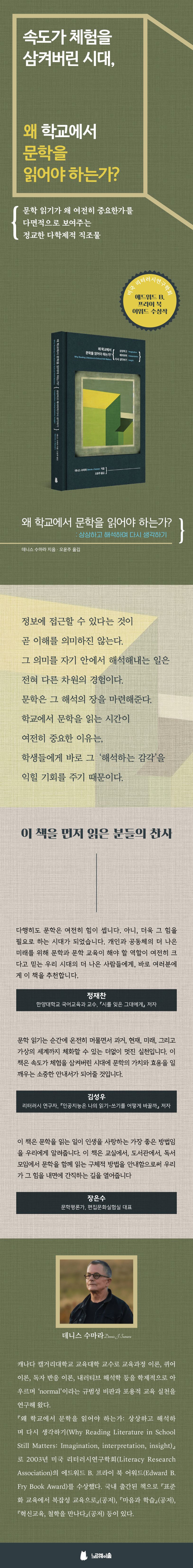 수년 동안 예비 교사들을 가르치며 교육과정 및 방법을 고안해 온 데니스 수마라 교수는 이 원론적인 질문에 대한 답을 생각의 기술에서 찾는다. 『왜 학교에서 문학을 읽어야 하는가: 상상하고 해석하며 다시 생각하기』라는 제목에서도 드러나듯, 수마라 교수는 인간에게 고유한 상상력과 해석, 통찰이라는 생각의 기술을 키우고 확장ㆍ심화하는 것을 교육의 진정한 역할이라고 보며, 그런 교육 활동의 가장 좋은 교본으로 문학을 삼는다. 인간의 본성을 묻고, 인간과 다른 생명체의 관점을 상상하고, 우리를 서로 연결하는 문학 본연의 힘을 우리 아이들의 문학 교실에서, 특히 공교육의 장에서 실현하는 일이 그 어느 때보다 긴요하고 시급한 과제임을 밝힌다.