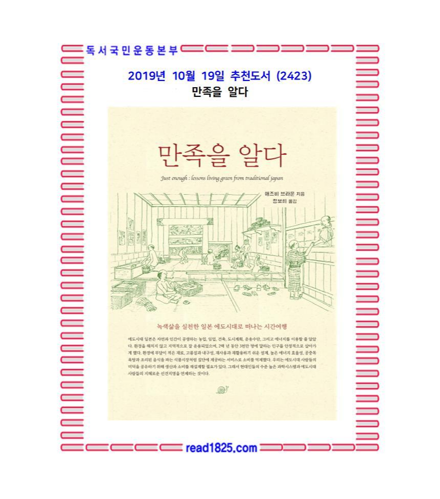 『만족을 알다』는 2백여 년 전 일본 에도시대(1603~1868) 후기, 즉 전통기술과 문화가 무르익어 정점에 달했던 시대이자 서양에 문호를 개방하고 선진공업국 대열에 들어서기 직전 일본인들이 어떠한 삶을 살았는지에 관한 책이다. 에도시대 일본은 자연과 인간이 공생하는 농업, 임업, 건축, 도시계획, 운송수단, 그리고 에너지를 효율적으로 이용할 줄 알았다. 환경에 부담이 적은 재료, 고품질과 내구성, 재사용과 재활용하기 쉬운 설계, 공중목욕탕과 조리된 음식을 파는 식품시장처럼 도시인들에게 제공하는 서비스로 소비를 억제했다.