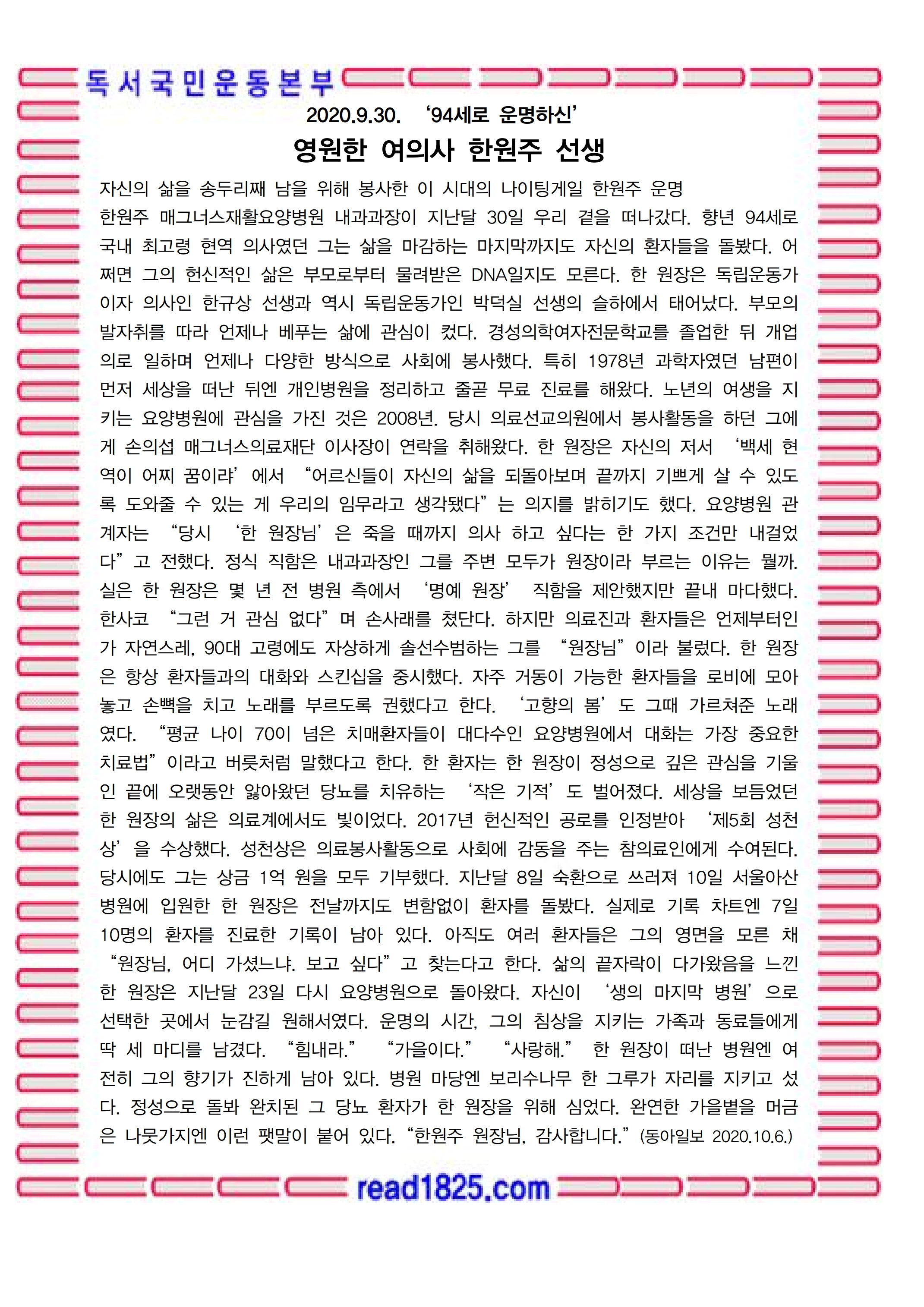 내가 한원주 선생님에 대해 알게 된 것은 꽤 오래전의 일이다. 직접 뵌 적은 없지만, 의료선교협회에서 운영하던 소규모 임상 클리닉에 닥터 한원주라는 분이 봉사자의 개념으로 근무하신다는 이야기를 들은 게 처음 접한 소식이었다. 그때는 ‘훌륭한 분이 계시는구나.’하는 생각이 들기는 했지만, 별다른 관심을 두지 않고 지나쳤다.