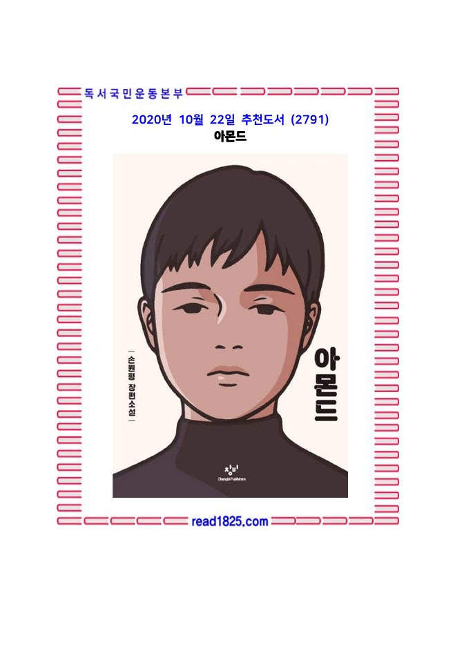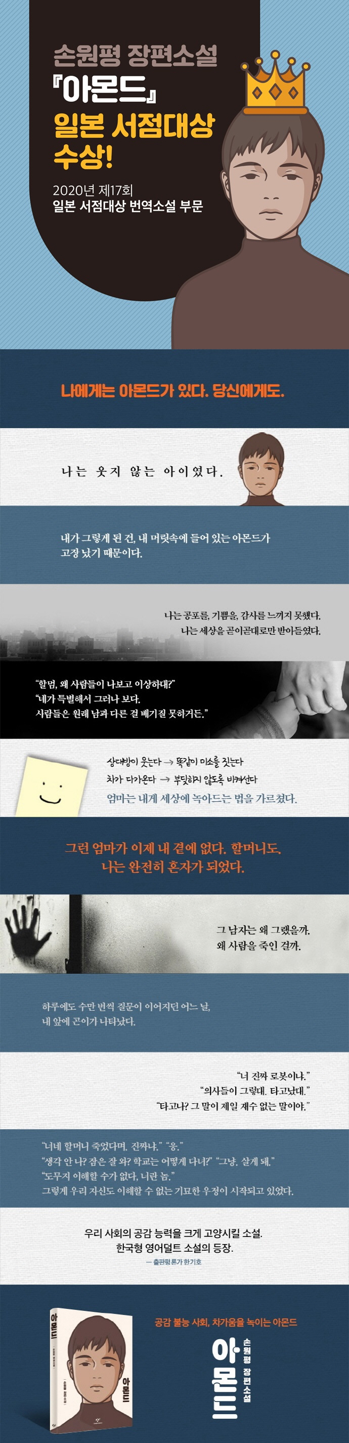 한국형 영어덜트 소설의 등장. 각박한 현실을 반영하듯 최근 영어덜트물의 경향은 주인공들이 극한의 고뇌를 겪거나 ‘삶 아니면 죽음’이라는 가혹한 선택에 직면한다는 것이다. 『아몬드』의 주인공 윤재도 마찬가지다. 윤재는 감정이 고장 난 아이다. 그러나 우리 사회에서 과연 윤재가 특별하고 별난 경우라고 볼 수 있을까? 공감을 잃어버린 시대에, 이 소설은 우리에게 타자를 상기시키고 고통을 표현하며 다른 삶을 상상하게 한다. 비극적인 존재들이 서로의 아픔과 상처를 온몸으로 끌어안고 고통 위를 기어 조금씩 앞으로 나아갈 것임을 예감케 한다. 내가 아닌 타인에 대해 상상해 보는 것은 공감의 씨앗이다. 그리고 그 씨앗이 바로 우리가 믿을 수 있는 유일한 약속이자 희망이다. 신체는 커 버렸지만 감정적으로는 성장하지 못한 사람들이 넘쳐나는 현실, 『아몬드』는 고통과 공감의 능력을 깨우치게 할 강력한 소설로, 침체된 한국 소설시장에 파장을 몰고 올 것이다. -출판평론가 한기호