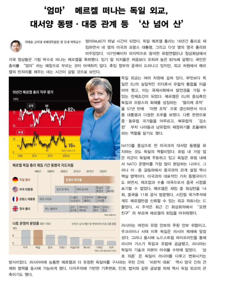 메르켈 재임 16년간, 세계 정치 무대에선 수많은 지도자들이 등장하고 퇴장했다. 조지 W 부시, 버락 오바마, 도널드 트럼프, 조 바이든, 자크 시라크, 니콜라스 사르코지, 에마뉘엘 마크롱, 시진핑, 블라디미르 푸틴, 토니 블레어, 데이비드 캐머런, 보리스 존슨…. 대다수가 남성인 정상들의 거친 외교 각축장에서도 앙겔라 메르켈은 가장 돋보였다. 특히 메르켈은 푸틴과 트럼프 등 권위주의 지도자들을 때론 어르고 한편 달래며 세계가 존중해야 할 룰과 가치를 지켜냈다.
