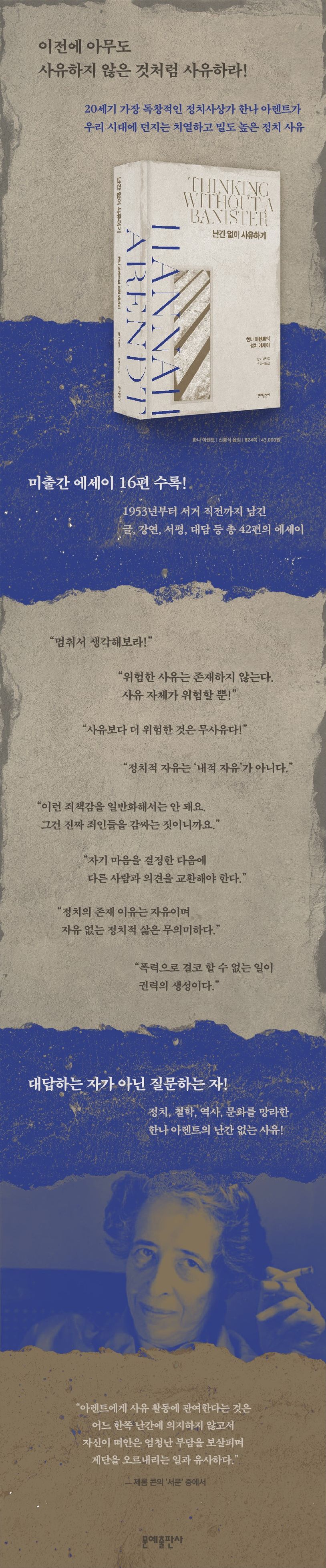 이 책의 제목인 ‘난간 없이 사유하기’는 아렌트의 정치 사유를 표현하는 대표적인 말이다. ‘난간’은 우리가 사유하고 판단할 때 기대는 전통적인 개념으로, 난간을 붙들지 않고 사유한다는 것은 우리의 정신을 지배하는 모든 것에서 벗어나 자유롭게, 완전히 새롭게, 기준도 틀도 없이 사유한다는 의미라고 볼 수 있다. 난간이 없다는 것은 자유로우나 위험하며, 언제 끝모르는 바닥으로 곤두박질칠지 모른다는 두려움과 부담을 안고 계단을 올라야 한다. 하지만 사유란 그런 것이다. 위험하지만 용기 있게 나아가는 것, 어디에도 의존하지 않고 치열하게 사유한 끝에야 세상과 인간, 자유와 삶, 정치가 무엇인지 가닥을 잡을 수 있고 그 속에서 인간다운 삶과 정치를 이야기할 수 있다. 아렌트의 에세이에는 고전 철학부터 중세 철학, 근대의 지형을 바꾼 혁명들, 양차 세계대전 등 철학, 역사, 정치, 문화가 망라되어 있다. 아렌트는 대답하는 자가 아닌 질문하는 자로서 전통적인 기준과 틀의 한계를 벗어나 새로운 시각으로 현상과 사건의 의미를 좇으며 진정한 난간 없는 사유를 보여준다.
