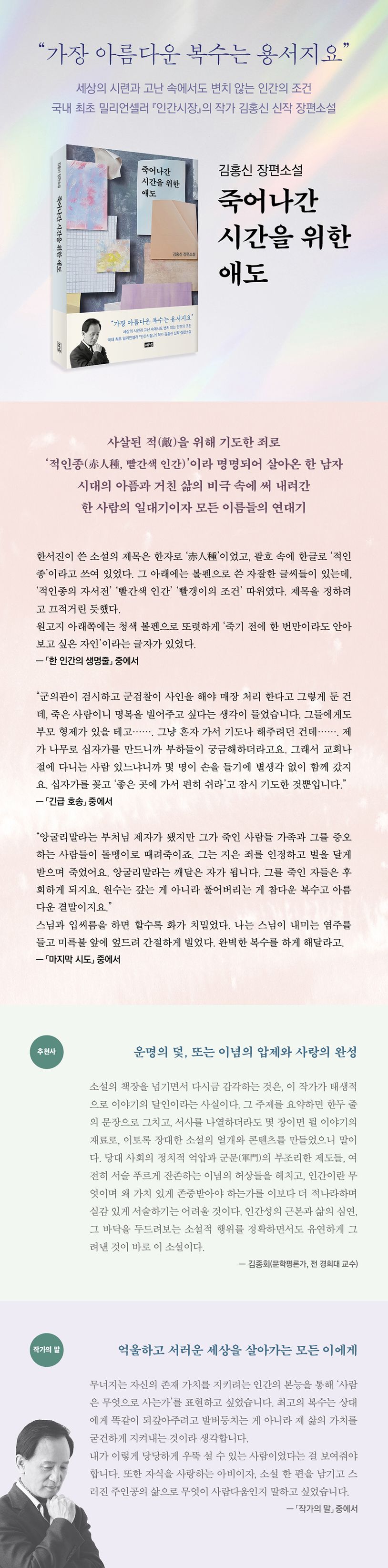50년 가까운 시간을 문학에 바친 영원한 글쟁이 김홍신의 노련한 필력이 신작 「죽어나간 시간을 위한 애도」에도 고스란히 녹아났다. 액자 형식과 시점의 변화를 통해 극의 입체감을 더했고, 주인공의 심리 변화와 고문 과정 등에 대한 적나라한 묘사는 독자의 몰입을 강화한다. 긴장감 넘치는 한 편의 소설이 마침내 애도문으로 글의 장르가 확장되고, 그 찬란하도록 슬픈 변곡점에서 삶과 죽음의 경외감을 독자들에게 선사할 것이다.
