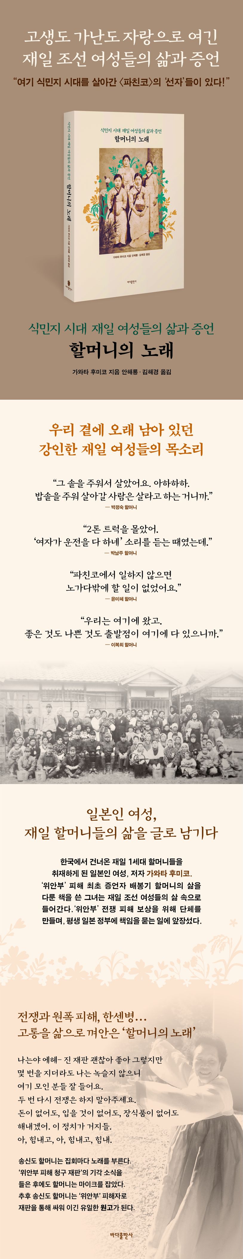 이들의 이야기는 월간지 『세카이(世界)』에 ‘할머니의 노래(ハルモニの唄)-재일 여성의 전중·전후’라는 제목으로 2012년부터 1년 여간 총 12회에 걸쳐 연재되었다. 이들을 직접 찾아가 작은 것 하나 놓치지 않고 기록으로 남기려 애쓴 저자는 한국인도 재일 코리언도 아닌, 일본 여성 가와타 후미코이다.