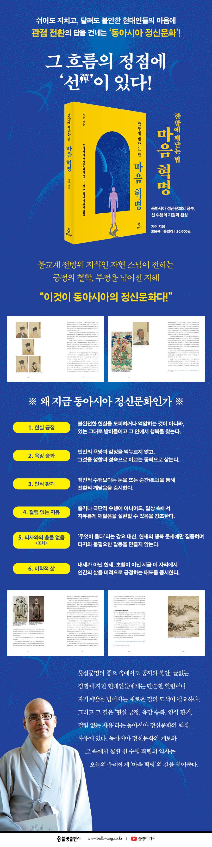 이 책은 ‘현실 긍정, 욕망 승화, 인식 환기, 걸림 없는 자유’라는 동아시아 정신문화의 핵심 사유를 중심에 두고, 삶 전체를 바꾸는 ‘관점 전환’의 힘을 강조한다. 특히 동아시아 정신문화의 바탕이라 할 수 있는 일원론적 세계관을 토대로, 공자와 노자로 대표되는 유교ㆍ도교의 사상, 불교 전래와 위ㆍ진남북조의 혼융, 당나라 혜능의 돈오, 송대 대혜 종고의 일상적 수행론 등 동아시아 정신문화 변천의 흐름을 따라가며, 이러한 사유가 삶과 분리되지 않고 이미 완전한 본성을 환기하는 수행, 곧 선(禪) 수행 전통으로 어떻게 완성되었는지를 보여준다.