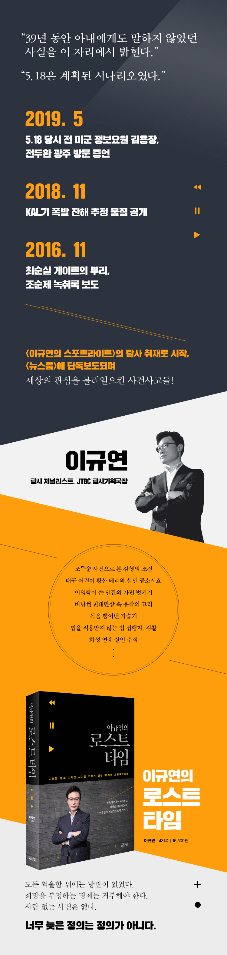 [이규연의 스포트라이트]의 이규연이 주목한 36개 사건의 주체 못할 이면과 사람의 참지 못할 울음. 이것은 암흑의 핵심으로 파고들어가 빛을 발견하는 일과, 그 일을 해야만 하는 이유에 대한 한 탐사 저널리스트의 기록이다. 누군가 고통받는 시간이자 정의가 지연되는 시간인 ‘로스트 타임’을 줄이기 위해 그가 뛰어다녔던 현장 속에서, 우리는 지난 30년간 탐사보도 한길을 걸으며 그 길을 개척해온 공익 탐정의 분투와 성장을 확인할 수 있다.