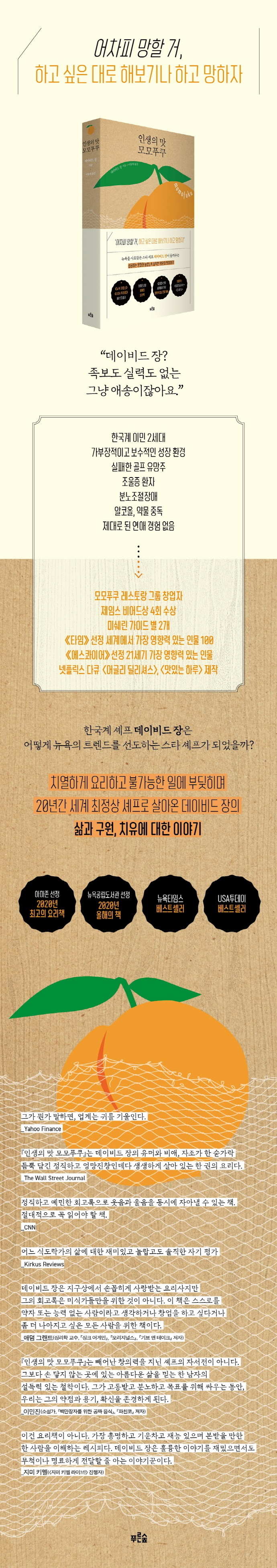 솔직함과 치열함, 유머로 가득한 『인생의 맛 모모푸쿠』는 데이비드 장의 굴곡진 연대기인 동시에 같은 시대를 사는 우리에게 고통스러운 일상에서도 맛있게 인생을 요리하는 노하우를 전수해줄 것이다.