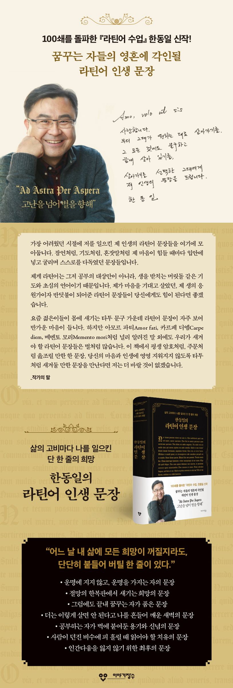 그러나 가난한 집안의 소년 한동일이 바티칸 대법원의 변호사가 되기까지-수없이 고난에 직면하면서 스스로에게 실망하고 가족과 주변 사람들에게 실수하다가도 끝내 그의 재능을 알아봐주는 스승을 만나 꿈에 한 발씩 다가서온 한동일의 인생 스토리는 지금까지 잘 알려져 있지 않았다. 이 책은 라틴어 잠언집인 동시에 한동일 작가의 뜨거운 고백록이기도 하다.