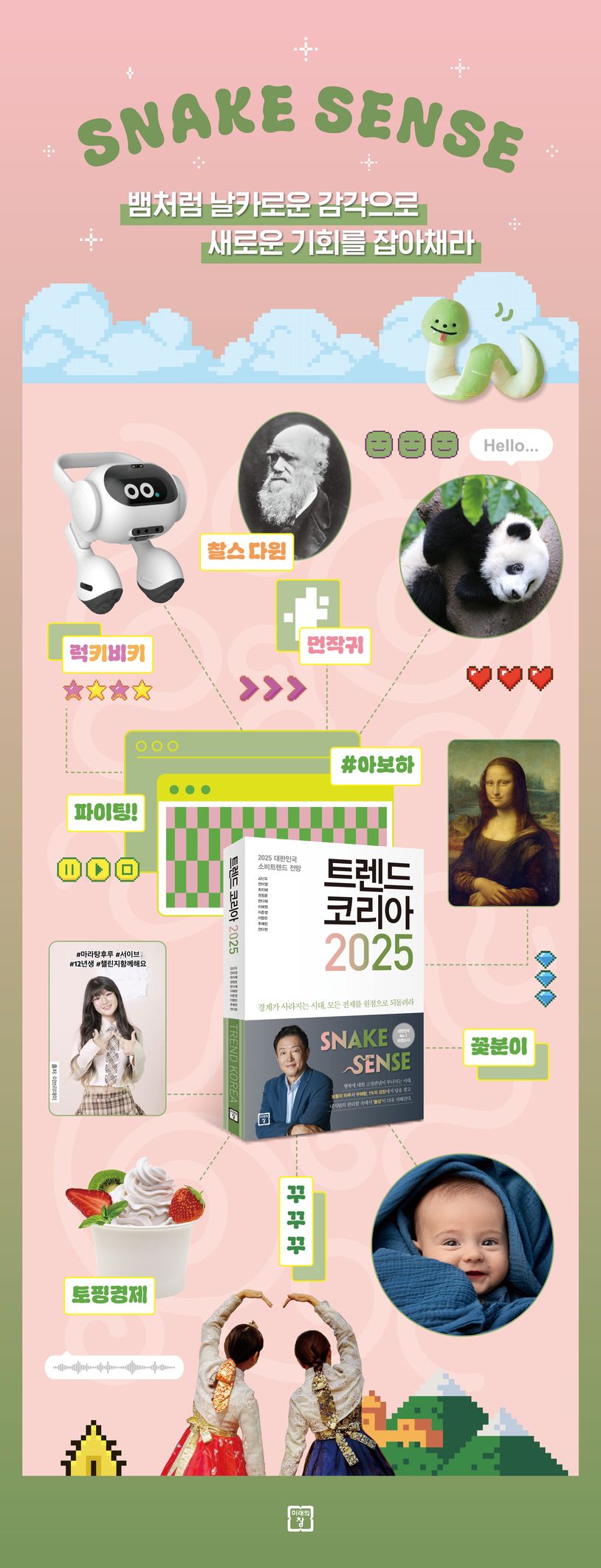 이 밖에 뱀의 해, 〈트렌드 코리아 2025〉가 제시한 기후감수성, 토핑경제, 원포인트업 키워드는 옴니보어 소비자들의 일상과 #아보하, 무해력를 좇는 사람들의 면면을 비춘다. 디지털 시대에 더욱 강한 매력을 발산하는 물성에 대한 추구를 다룬 ‘물성매력’, 기술에 인간의 얼굴을 입히기 위한 기술의 움직임을 담은 ‘페이스테크’, 적과 나를 가리지 않고 공생과 진화를 모색하는 새로운 비즈니스 전략인 ‘공진화 전략’은 급변하는 비즈니스 현장에서 남다른 감각으로 먹이를 잡아채는 뱀의 놀라운 능력과 닿아있다.