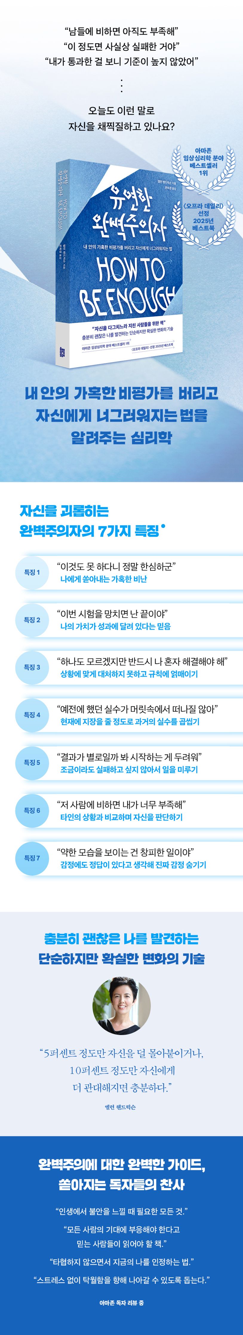 “남들에 비하면 아직도 부족해.” “이 정도면 사실상 실패한 거야.” “내가 통과한 걸 보니 기준이 높지 않았어.” 평소에 이런 말을 달고 사는가? 그렇다면 당신도 완벽주의자일 확률이 높다. 완벽주의자의 내면에는 언제나 자신에게 가혹한 비평가가 살고 있기 때문이다.