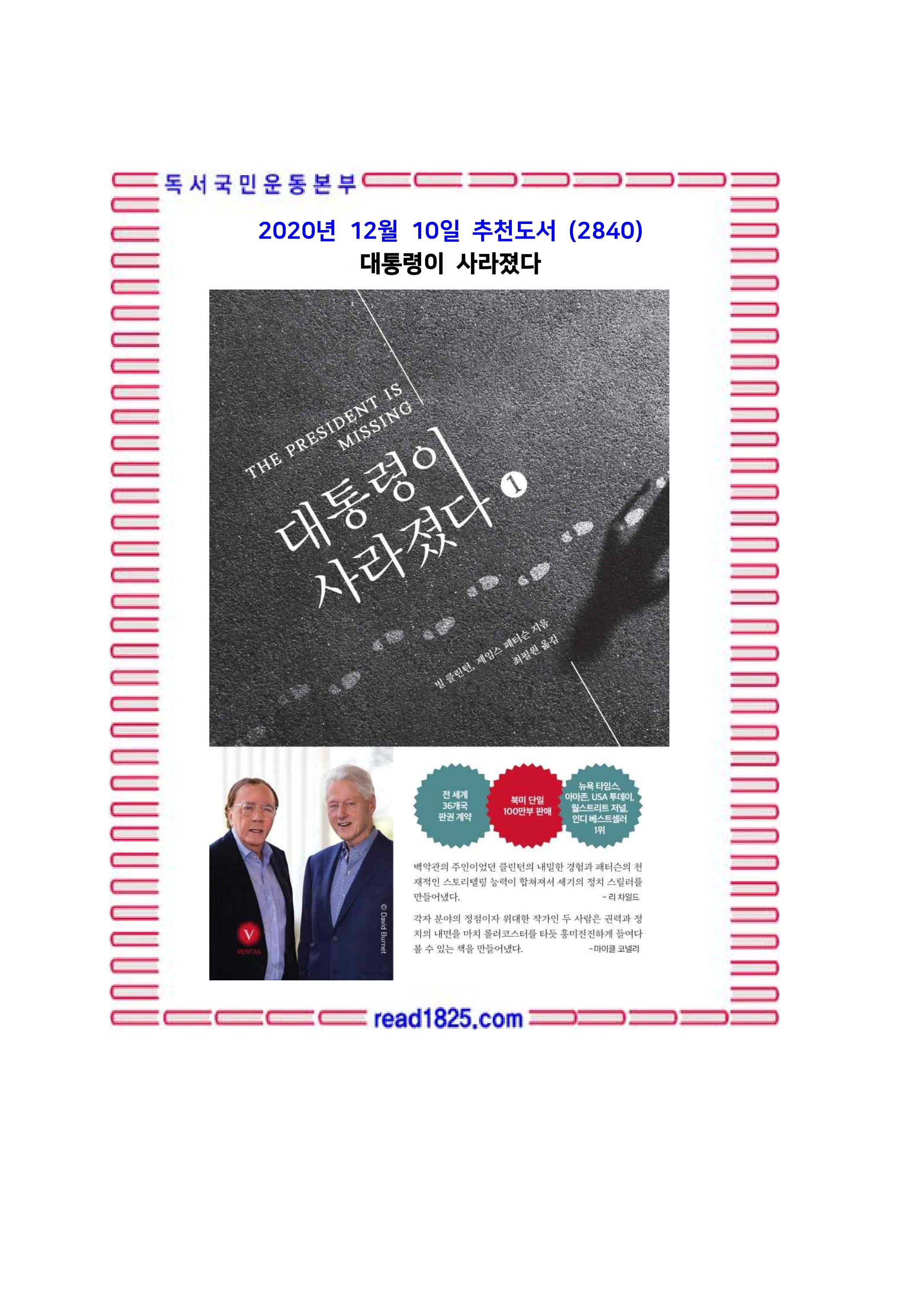 정치와 소설, 각자의 분야에서 정점을 이룬 빌 클린턴과 제임스 패터슨. 이 두 사람이 뭉칠 거라는 생각을 누가 했을까. 전 백악관 주인만이 알고 있는 내밀한 경험이 스며든 이 소설은 출간 후 미국 서점가를 휩쓸며 뉴욕 타임스, 아마존, USA 투데이, 월스트리트 저널, 인디 베스트셀러 1위에 등극했다. 제임스 패터슨은 픽션 베스트셀러 단골손님 중 하나로 3억 부 이상의 종이책 판매와 미국에서 최초로 전자책 100만 부를 판매한 특급 작가 중 하나이다. 미국 추리작가협회가 주는 에드거상을 비롯하여 각종 스릴러상을 받은 증명된 작가이기도 하다.