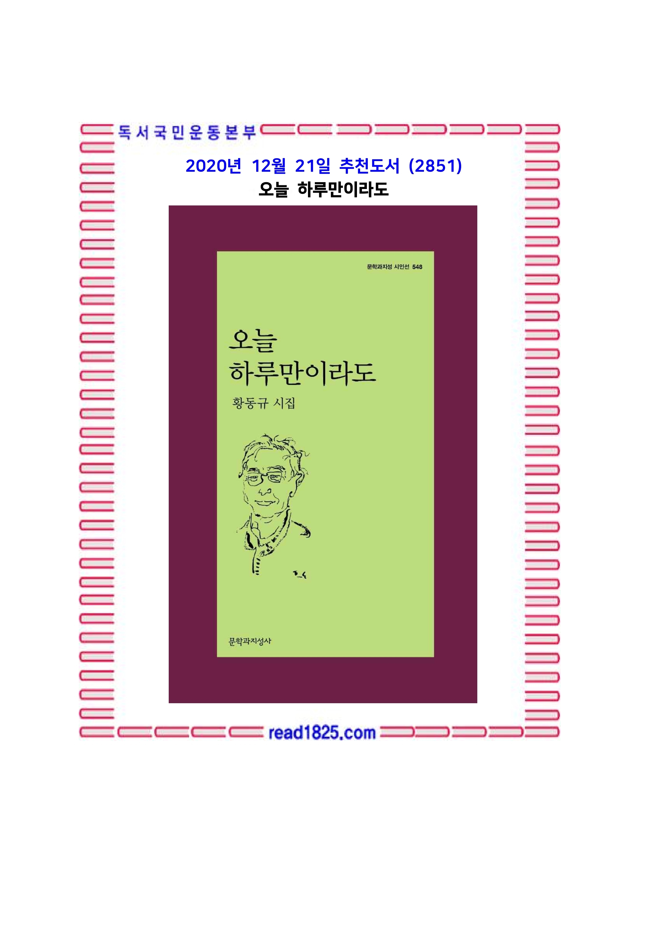 황혼의 잔잔한 일상에서 발견한 소중한 생의 기미들을 활력 넘치는 변주곡으로 연주해내는 『오늘 하루만이라도』. 어쩌면 시인의 말처럼 이 책이 생전의 마지막 시집이 될지는 모르지만 아직 황동규의 펜이 움직이고 있음 또한 우리는 기억할 것이다. 인간과 사회, 산천의 풀포기 하나에까지 책임감을 느끼며, 끝내 “못 가지고 가는 시”(뒤표지 글)를 세계에 남겨주고자 골몰하는 시인. 일신우일신의 표본처럼 매번 거듭나고 변화하여 성장에 이르는 황동규 시의 아름다움이 오늘 하루도 빛난다.