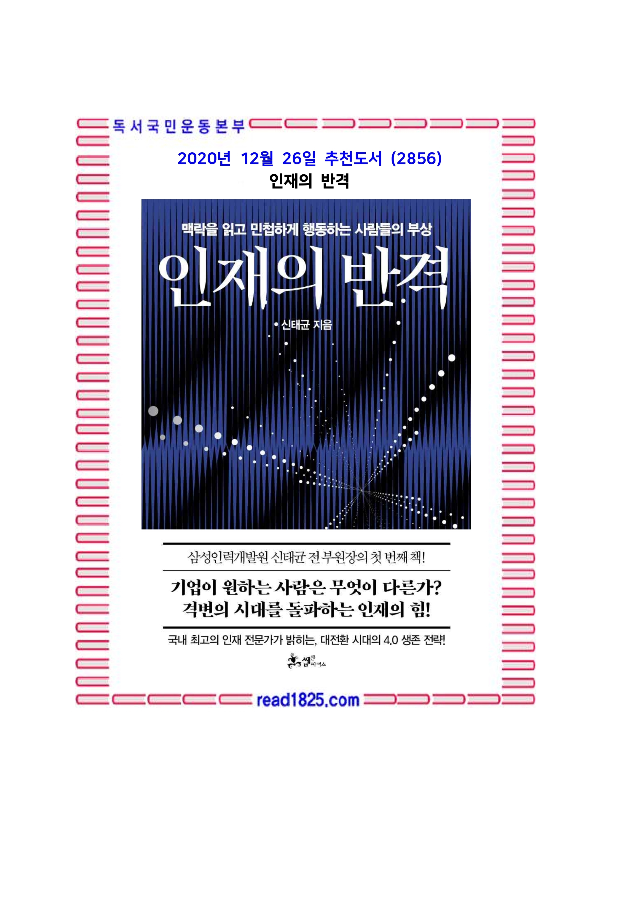삼성의 ‘인재 사관 학교’라 불리는 삼성인력개발원에서 최고학습책임자(CLO. Chief Learning Officer)를 지낸 신태균 전 부원장의 책이 출간됐다. 저자는 1990대부터 지난 30여 년간 삼성그룹의 ‘신경영’ 종합 체계와 21세기형 글로벌 핵심 가치 정립을 주도하고, 최고 경영자 및 글로벌 리더 인재 양성 프로그램을 다수 개발해온 굴지의 인재 전문가다. 2010년대에 들어서도 저자는 삼성경제연구소(SERI), 청춘 토크 콘서트 ‘열정樂서’ 등에서 활발히 강연을 펼치며 새로운 시대에 걸맞은 새로운 인재의 역할과 필요성을 강조해왔다.