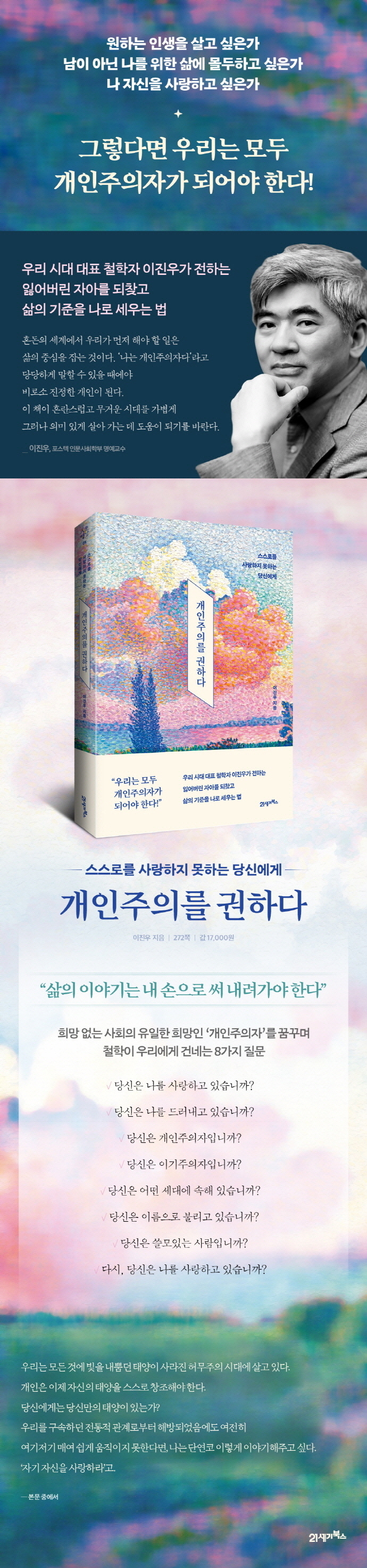 타인의 눈치를 보며 사는 일에 지쳤다면, 일상에서 부딪히는 기준들 때문에 나만의 개성을 발휘하지 못한다고 느낀 적 있다면, 본연의 내 모습을 드러내는 것이 부끄럽다면, 이진우 교수가 전하는 메시지에 귀 기울여 볼 것을 권한다. 이 책을 통해 ‘나는 개인주의자다’라고 당당하게 말할 수 있는 용기, 무거운 시대를 가볍게 그러나 의미 있게 살아가는 데 필요한 힘을 얻게 될 것이다.
