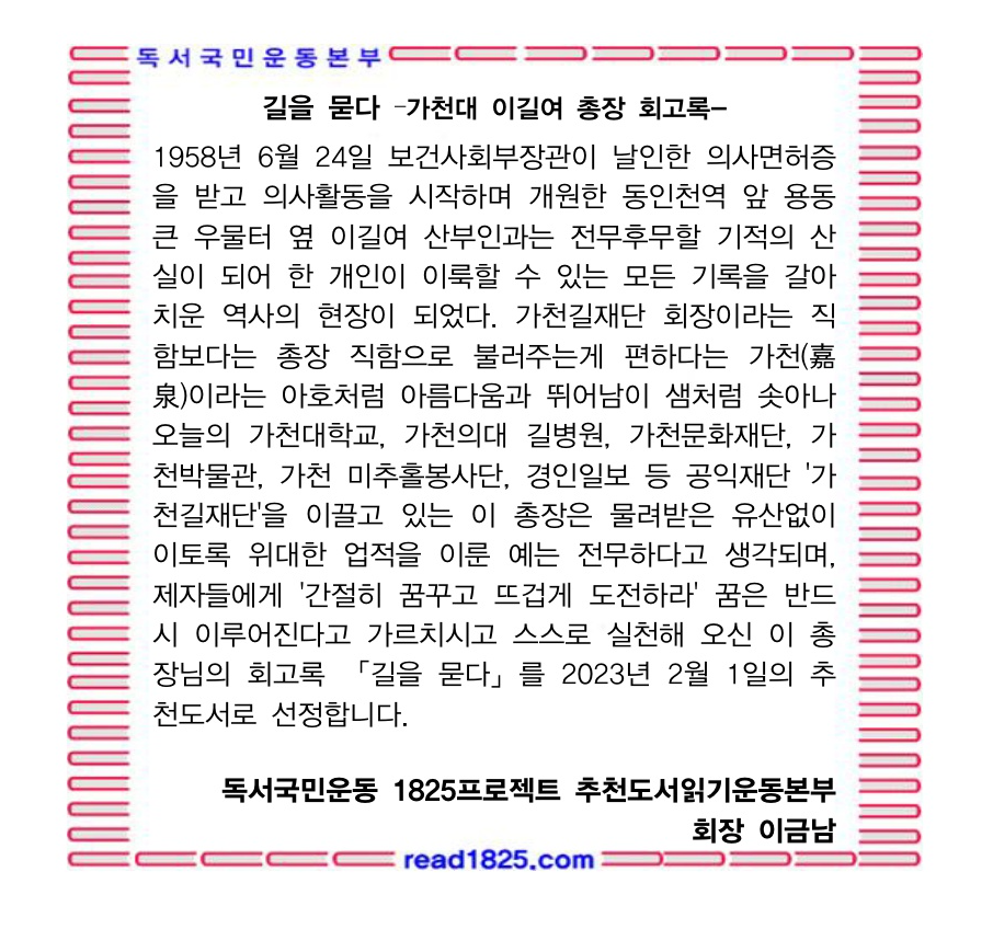 한국여자의사회 회장, UN 여성대회 정부 대표, 서울대 의대 동창회장, 의사협회 100주년 위원회 위원장 등을 역임했으며, 2022년 현재 가천대학교 총장으로 재직 중이며 가천의대 길병원, 가천문화재단, 가천박물관, 새생명찾아주기운동본부, 가천미추홀봉사단, 경인일보에 이르기까지, 의료ㆍ교육ㆍ문화ㆍ봉사ㆍ언론 분야를 아우르는 국내 최대의 공익재단인 ‘가천길재단’을 이끌고 있다.