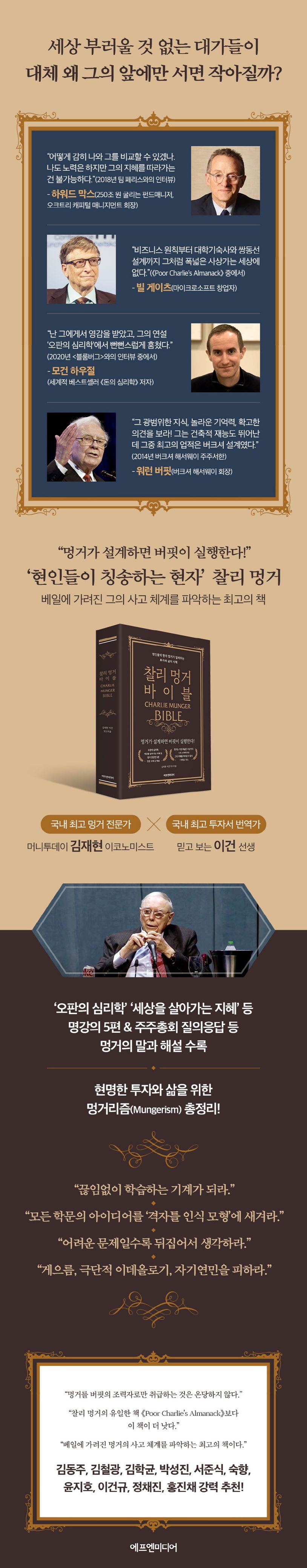 벤저민 그레이엄과 워런 버핏은 익숙하지만, 찰리 멍거는 다소 생소할 수 있다. 그러나 세계 최고의 투자자라는 버핏도 2014년 버크셔 해서웨이 주주 서한에서 멍거를 자신의 스승이며 ‘버크셔의 설계자’라 공언했듯, 멍거의 실제 위치는 우리가 상상하는 것 이상이다. 월가의 투자 거장 하워드 막스는 2018년 팀 페리스와의 인터뷰에서 “나도 노력은 하지만 멍거의 지혜를 따라가는 건 불가능하다”고 밝힌 바 있다.