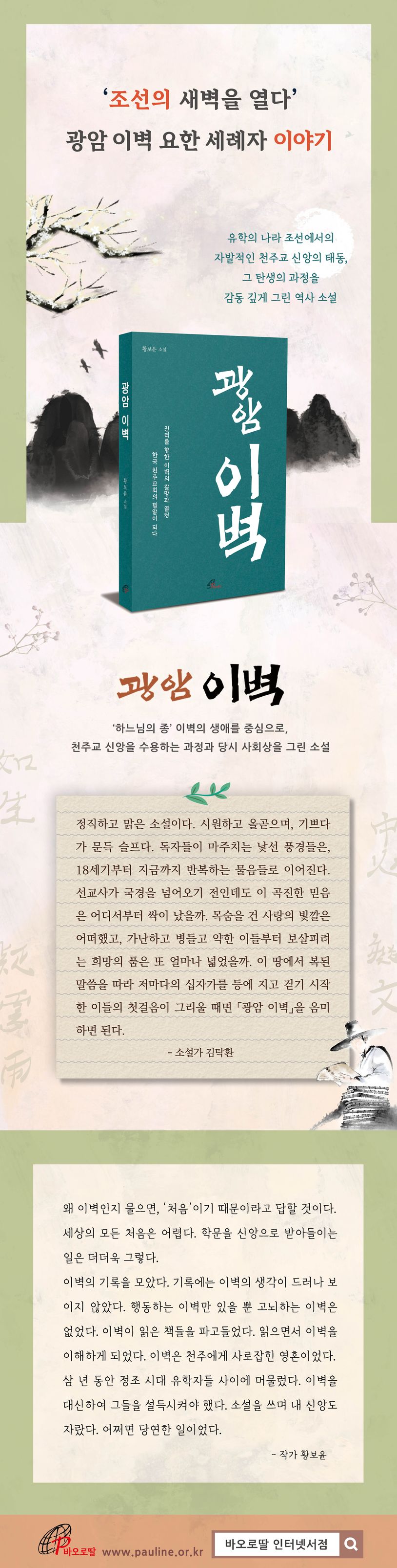 「광암 이벽」은 한국 천주교의 선구자 이벽(요한 세례자, 1754~1786)의 생애를 담은 소설이다.