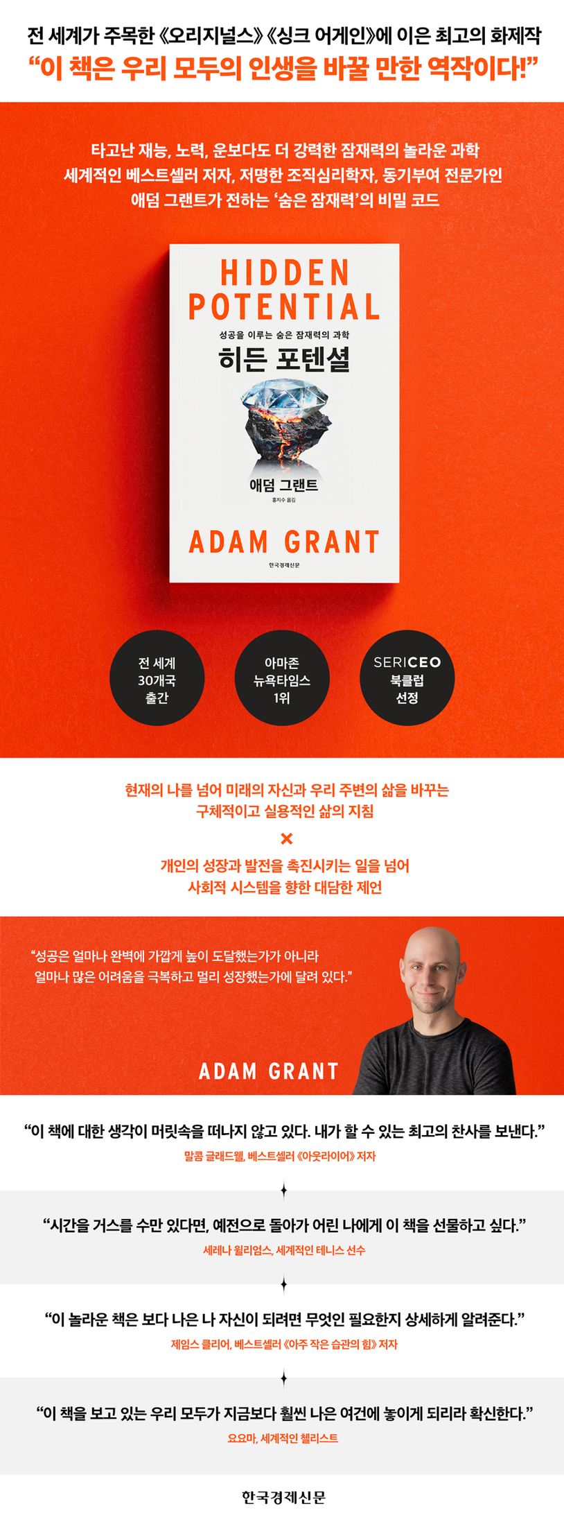 타고난 재능은 기회와 환경, 동기부여의 차이에서 비롯된 결과일 뿐, 누구나 자신 안에 ‘숨은 잠재력’을 발휘하여 더 높이, 더 멀리 날 수 있다! 심리학은 물론 경제경영, 자계계발 분야를 넘나드는 탁월한 주제 선정과 우리 삶에 도움이 되는 행동 지침과 선한 영향력까지… 출간하는 책마다 센세이셔널한 반향을 불러일으키며 세계적인 베스트셀러로 자리매김한 《기브 앤 테이크》, 《오리지널스》, 《싱크 어게인》의 저자이자 와튼스쿨 조직심리학과 최연소 종신교수인 애덤 그랜트가 우리 자신과 다른 사람들을 예상치 못한 수준으로까지 끌어올릴 수 있는 방법에 대한 이야기를 담은 《히든 포텐셜》을 펴냈다.