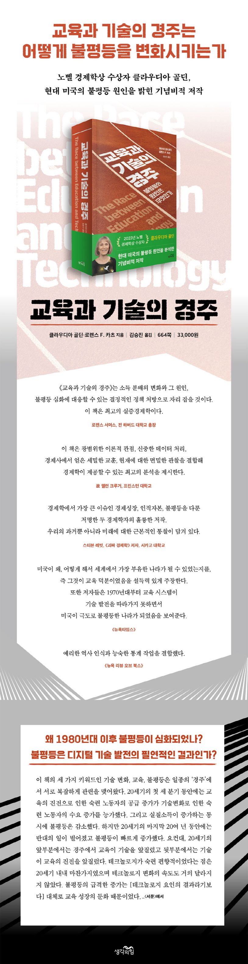 인류의 번영을 위한 기술 발전이 오히려 인류에게 위협으로 다가오는 지금, 고등학교 졸업장, 대학 졸업장을 가지고 있는 것만으로 필수 불가결한 사람이 되었던 건 옛날옛적 이야기다. 내가 가진 숙련기술을 컴퓨터 프로그램이 모방하거나 대체할 수 있을 때는 더욱 그렇다. 그런 의미에서 《교육과 기술의 경주》는 최근 AI(인공지능)로 대표되는 급속한 기술 발전이 노동의 성격과 일자리 수요를 어떻게 바꿀지, 이에 대처할 수 있는 교육의 역할은 무엇일지 모색하는 데에도 깊은 통찰을 제공할 수 있을 것이다.