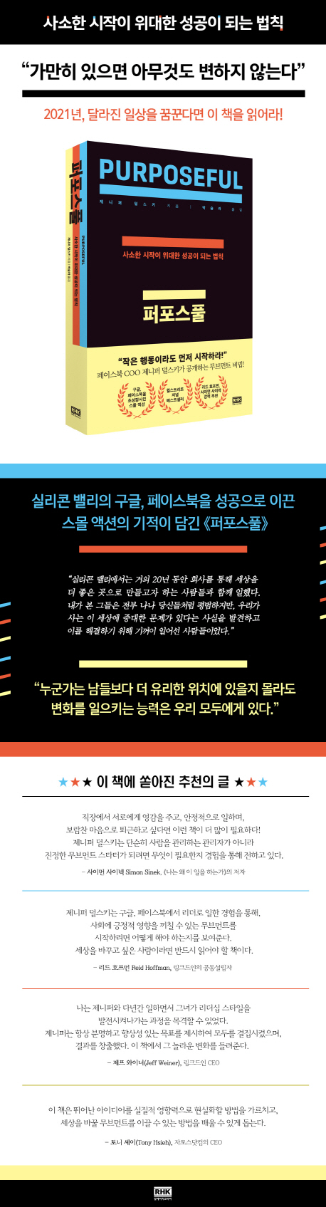 야후, 구글, 페이스북 등 거대 플랫폼에서 수십년 동안 수집된 성공 노하우를 통해 우리에게 뚜렷한 방향성을 제시하고 있는 퍼포스풀. 무언가를 시작하기에 너무 작다고 생각하는 이들에게 실질적인 발자취를 남길 수 있도록 도울 것이다.