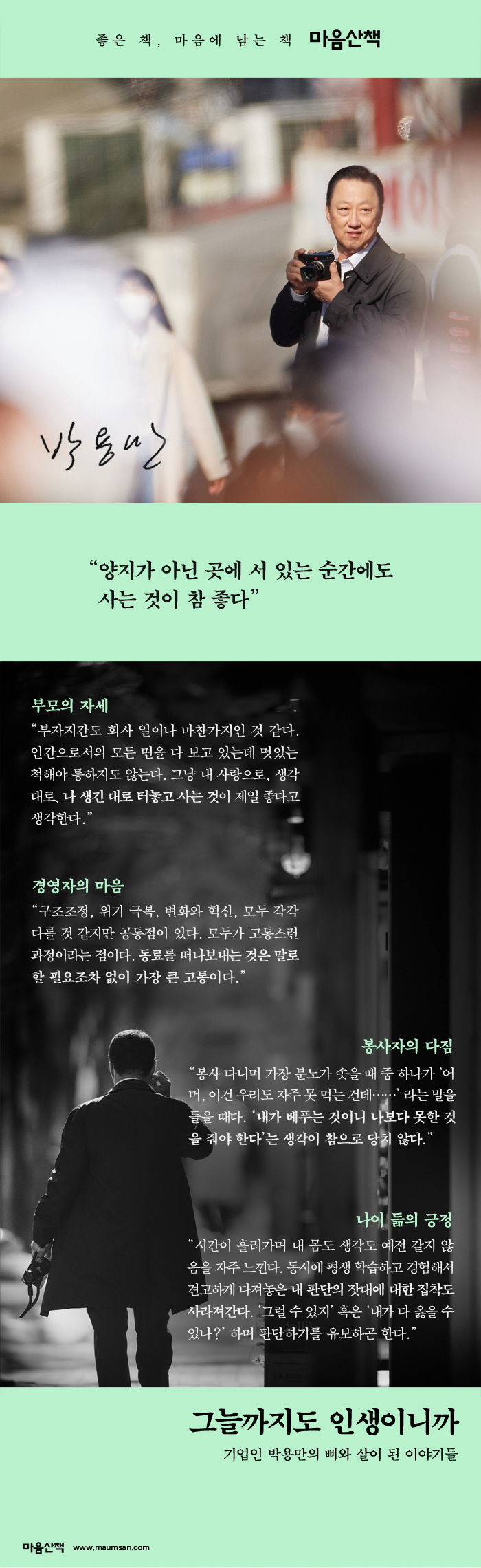 『그늘까지도 인생이니까』는 기업인으로 성장하기까지의 개인사, 경영 일선에서 흘린 땀과 눈물, 그가 지켜온 가치와 꿈꿔온 미래에 대한 박용만의 기록이다. 이 책을 통해 독자들은 경영인 박용만의 일의 경험뿐 아니라 그 이면의 자연인 박용만의 다양한 활동과 시각을 만날 수 있다. 무엇보다 빛나는 것은 그의 태도다. 일이든 관계든 최선을 다하되 긍정을 잃지 않는 여유, 타인의 아픔에 공감할 줄 아는 휴머니스트다운 면모는 멋지게 나이 들고 싶은 독자들에게 괜찮은 어른을 만나는 드문 경험을 선사할 것이다.