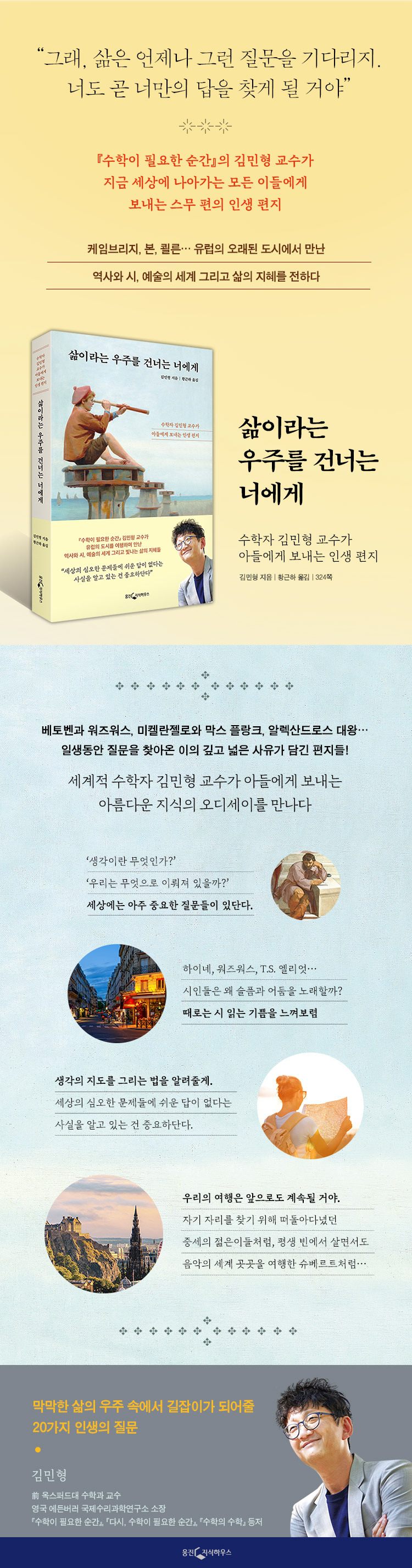 김민형 교수는 2005년 퍼듀대학교 교수로 임용되기 전 세계 수학자들과의 교류를 위해 2개월에 걸쳐 영국의 뉴턴연구소와 독일의 막스플랑크연구소, 오버볼파흐수학연구소 등을 방문했다. 당시 그가 아들에게 보낸 편지들에는 유럽 지성의 산실에서 다양한 영감을 받으며 일생의 연구에 한 발씩 다가가는 지적 여정이 오롯이 담겨 있다. 후에 그는 첨단 위상수학과 고전 정수론을 융합하는 혁신적인 이론을 개발하여 세계적 수학자의 반열에 올랐고, 2012년 호암과학상을 수상했다.
