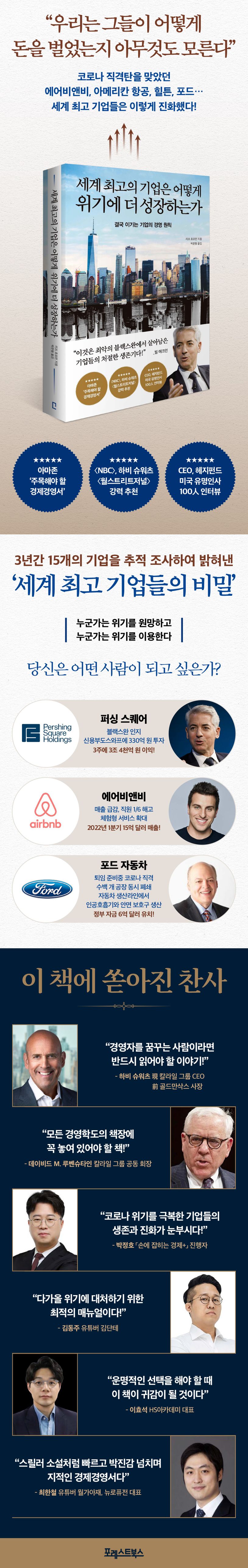 기업공개(IPO) 이슈로 통찰력을 잃어버렸던 에어비앤비의 브라이언 체스키, 수십억 달러의 구제금융을 받기 위해서 케이 스트리트(K-Street, 워싱턴 D.C. 인근의 로비 시장이 위치한 지역)와 백악관을 오갔던 아메리칸 항공의 더그 파커, 수백 개의 자동차 공장을 모두 폐쇄해야 했던 포드의 짐 해켓 등 18개의 초일류 기업과 기관의 고군분투 과정이 고스란히 담겨 있다.