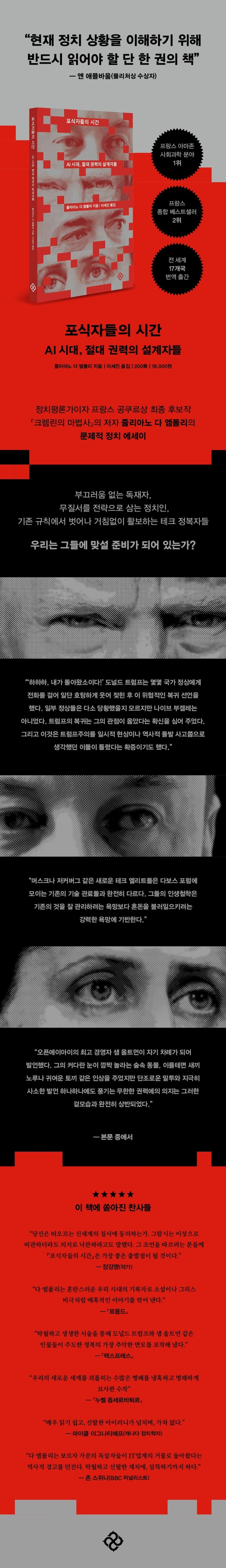 저자다 엠폴리는 부끄러움 없는 독재자, 무질서를 전략으로 삼는 정치인, 기존 규칙에서 벗어나 거침없이 활보하는 테크 정복자들이 만들어 낸 새로운 권력의 얼굴을 ‘포식자들의 시간’이라 명명한다. 그리고 마키아벨리적 시선으로 오늘날 우리 시대의 권력의 민낯을 정면으로 응시한다.