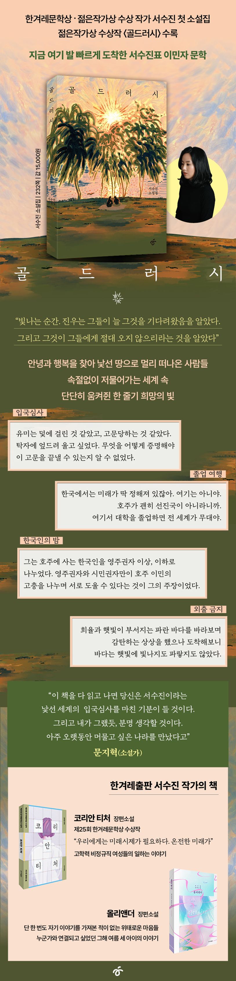 심사위원 전원의 지지를 받아 《코리안 티처》로 제25회 한겨레문학상을 수상한 서수진 작가의 첫 소설집 《골드러시》가 출간되었다. 《코리안 티처》는 “우리가 외면해선 안 될 이 나라의 진짜 모습을 가르쳐준다는 의미에서, K-자부심에 취해 있을지 모를 우리에게 때마침 찾아온 반가운”(신샛별 문학평론가) 작품이었다. 《골드러시》에는 “고전적인 비극의 우아함을 느꼈다”(은희경 소설가)라는 평을 받은 제13회 젊은작가상 수상작이자 표제작 〈골드러시〉와 미발표작 〈졸업 여행〉을 비롯해 2018년부터 2023년까지 6년간 집필한 작품 여덟 편을 모았다. 〈골드러시〉는 새로 발견된 금광에 많은 사람이 몰리는 현상을 뜻하는 제목과 상반되는 음산한 폐광, 차에 치여 죽어가는 캥거루, 온 세상을 붉게 물들이는 노을의 이미지로 젊은 부부의 저물어가는 사랑을 상징적으로 보여주는 작품이다. 호주에서만 누릴 수 있는 안녕과 행복을 좇아 한국을 떠났고 열정적으로 사랑했지만 지금 그들의 세계는 캥거루의 피처럼 온통 붉기만 하다.