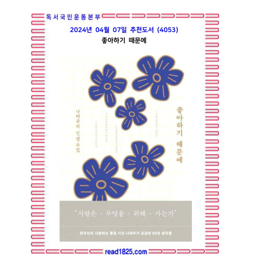 그렇게 탄생한 책의 제목 《좋아하기 때문에》는 그가 자주 쓰는 언어 중 하나인 ‘좋다’에서 착안했다. 평범한 언어지만 굳은 일상에 간지럼을 태워 미소 짓게 하는 말, 《좋아하기 때문에》는 칼이 되지 않고 꽃이 되는 삶을 꾸려가길 바라는 시인의 깊은 뜻이 들어 있을 테다. 부제는 ‘나태주의 인생(人生) 수업’이다. 달리 쓰면 ‘나태주의 일생(日生) 수업’인데, 80년간 하루하루를 충실히 살아온 충만한 생각을 조곤조곤 들려주기 때문이다.