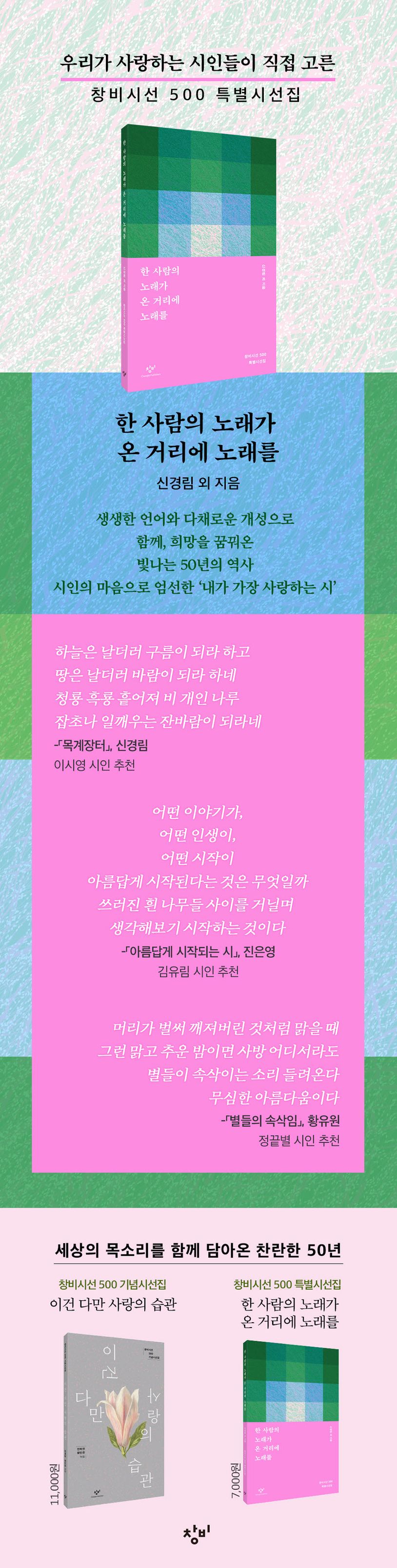 지난 50년간 한국시의 중추를 이뤄온 창비시선이 500번을 맞아 기념시선집 『이건 다만 사랑의 습관』과 함께 특별시선집 『한 사람의 노래가 온 거리에 노래를』을 출간했다. 특별시선집은 창비시선이 500번이라는 놀라운 궤적을 그려냈다는 사실을 축하하는 동시에 이것이 창비시선을 꾸준히 사랑해준 독자들이 있었기에 가능했음을 되새기기 위한 기획의 일환으로 꾸려졌다. 이번 시선집은 시인들이 직접 즐겨 읽는 시편들을 모았다는 점에서 뜻깊은 동시에 흥미를 더한다. 추천인은 『이건 다만 사랑의 습관』의 저자인 창비시선 400번대의 시인들이며, 창비시선 전체 작품을 추천대상작으로 했다. 그 결과 한국시의 빛나는 역사가 한권에 모인 것은 물론 형형색색 다채롭고도 읽는 재미가 가득한 시선집이 탄생할 수 있었다. 특별시선집이라는 기획 취지에 걸맞게 7천원이라는 저렴한 가격을 책정함으로써 『한 사람의 노래가 온 거리에 노래를』은 시를 사랑하는 독자에게는 더할 나위 없는 선물이, 시가 어렵기만 했던 이들에게는 더없이 좋은 마중물이 될 전망이다.