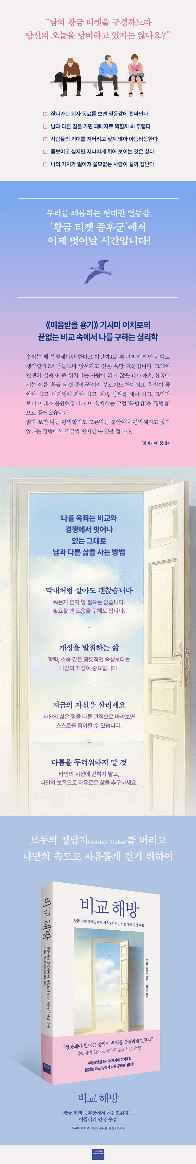 오늘날 한국 사회를 관통하는 키워드 중 하나는 바로 ‘황금 티켓 증후군’이다. 명문대 진학, 대기업 입사, 고소득 전문직이라는 한정된 ‘정답지’를 손에 쥐어야만 인생의 승리자가 될 수 있다는 강박이 우리 사회를 지배하고 있다. 그 결과, 우리는 타인과의 끝없는 비교와 경쟁 속에 내몰린 채 살아가고 있다. 기시미 이치로의 신간 《비교 해방》은 이처럼 세속적 기준에 매몰되어 스스로를 잃어가는 우리 내면의 문제를 아들러 심리학의 렌즈로 설득력 있게 분석한다.
