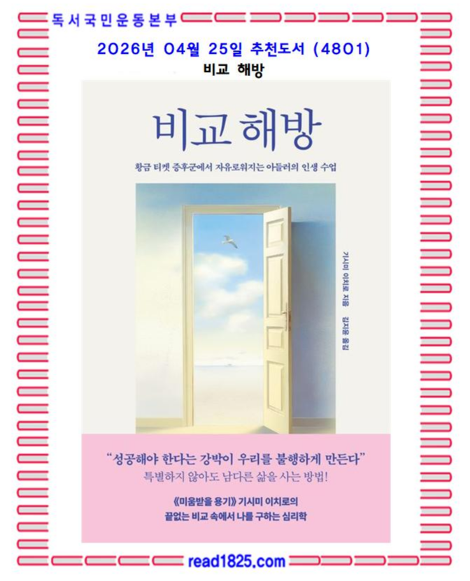 결국 우리가 ‘비교와 경쟁’이라는 감옥에 갇힌 것은 외부에서 문을 걸어 잠근 탓이 아니다. 우리 스스로 ‘특별해야만 가치가 있다’는 강박에 사로잡혀, 안에서 문을 잠그고 나오지 않는 것에 불과하다. 타인의 시선을 의식하며 정해진 트랙 위를 달리는 삶은 안전해 보일지 모르겠지만, 결코 진정한 자유에 이를 수는 없다. 《비교 해방》은 그 낡고 무거운 문을 열고 감옥 밖으로 당당히 걸어 나올 수 있도록 힘과 용기를 준다.