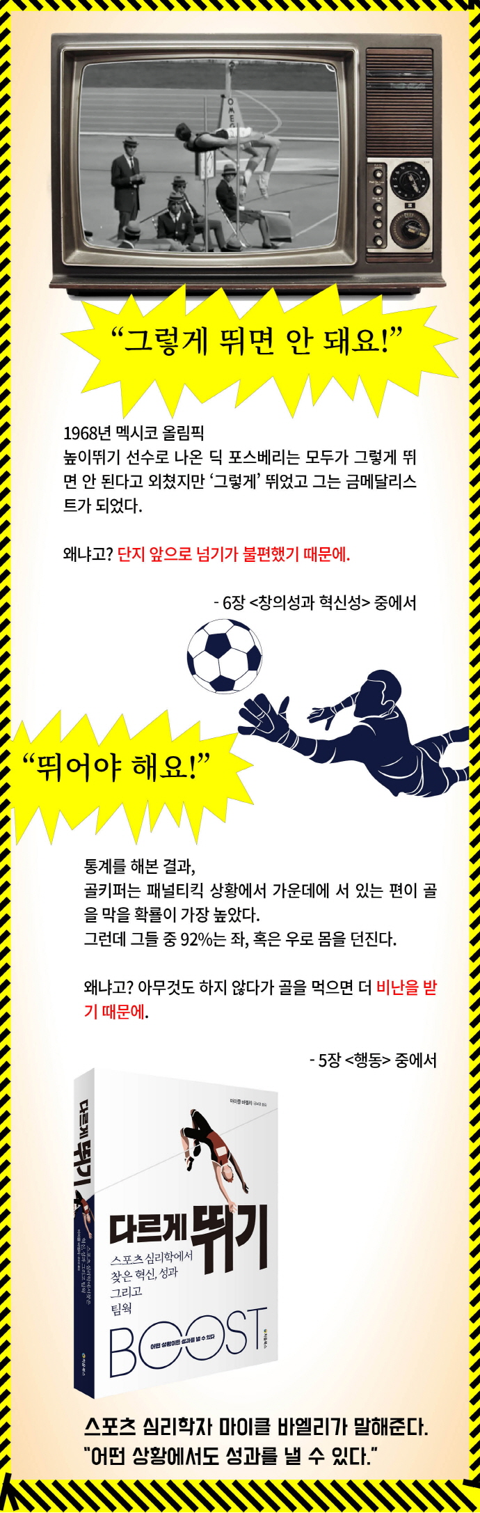 1968년 멕시코 올림픽에서 높이뛰기 선수 딕 포스베리가 점프를 시작하자 스포츠 해설자들이 동시에 소리쳤다. “그렇게 뛰면 안 돼요!” 딕 포스베리는 사상 처음으로 ‘배면뛰기’를 시도했다. 이전까지는 스트래들(다리 벌리고 앞 구르기)가 대세였다. 딕 포스베리가 배면뛰기를 한 이유는 단순했다. 스트래들이 자신에게 불편했기 때문이다. 불편을 참을 것인가, 혁신할 것인가?