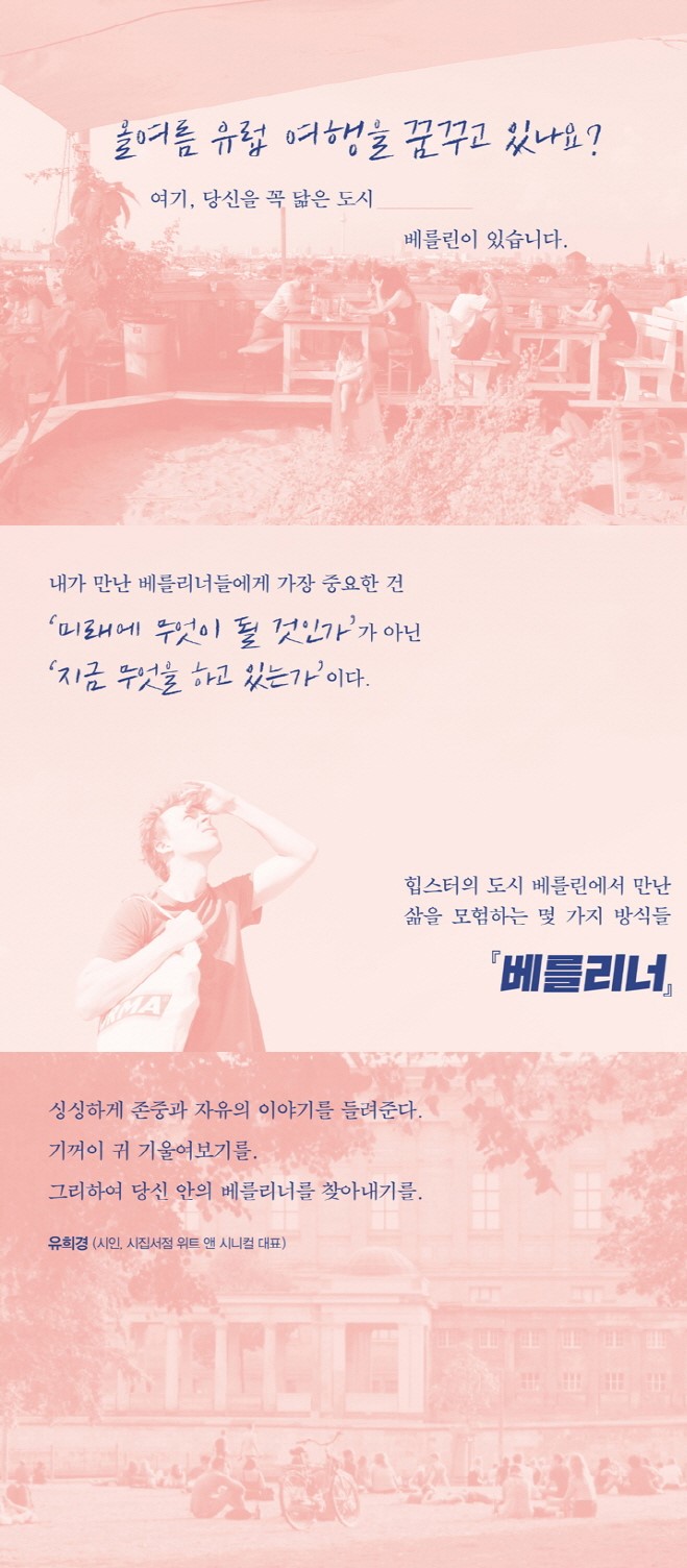 흔히들 말한다. 베를린은 가난해서 섹시하다고. 학생과 예술가가 대부분인 이 도시에서 돈을 벌어 여유롭게 살기란 거의 불가능에 가깝다는 이야기를 조금 비꼬아서 하는 말이다. 그래서 무슨 일이든 스스로 즐기지 않으면 온전히 버텨내기 힘들다. 나도 그랬다. 그러다 문득 베를리너, 그들의 삶이 궁금해졌다. 나 스스로 이상과 현실의 장벽에 부딪혀 헤매고 있을 때였다. 각개전투의 자세로 고군분투하는 친구들의 속사정을 듣고 싶었다. _‘프롤로그’에서